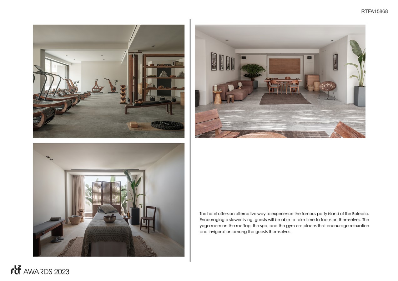 The hotel offers an alternative way to experience the famous party island of the Balearic. Encouraging a slower living, guests will be able to take time to focus on themselves. The yoga room on the rooftop, the spa, and the gym are places that encourage relaxation and invigoration among the guests themselves.