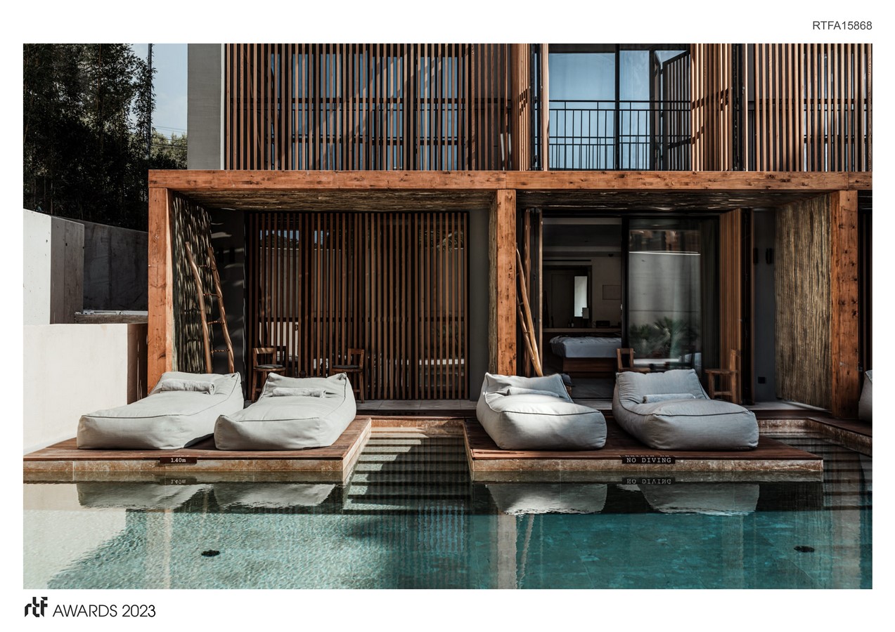 Each room in the interior space combines a minimal and bohemian style – which the island used to have – with modern elements (large paintings and head sculptures). The majority of the rooms consist of wooden, mobile elements in balconies with the aim of solar control radiation but simultaneously, offering privacy to the customers. That’s because the balconies are designed as ledges of the interior of the building.