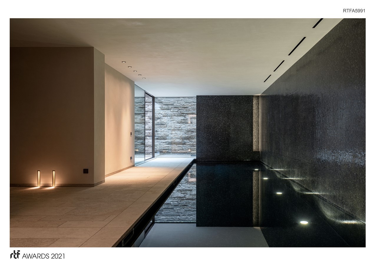 The upper Floor contains her private rooms. A sunken courtyard gives daylight to a dark tiled workout pool and the guest apartment in the basement.