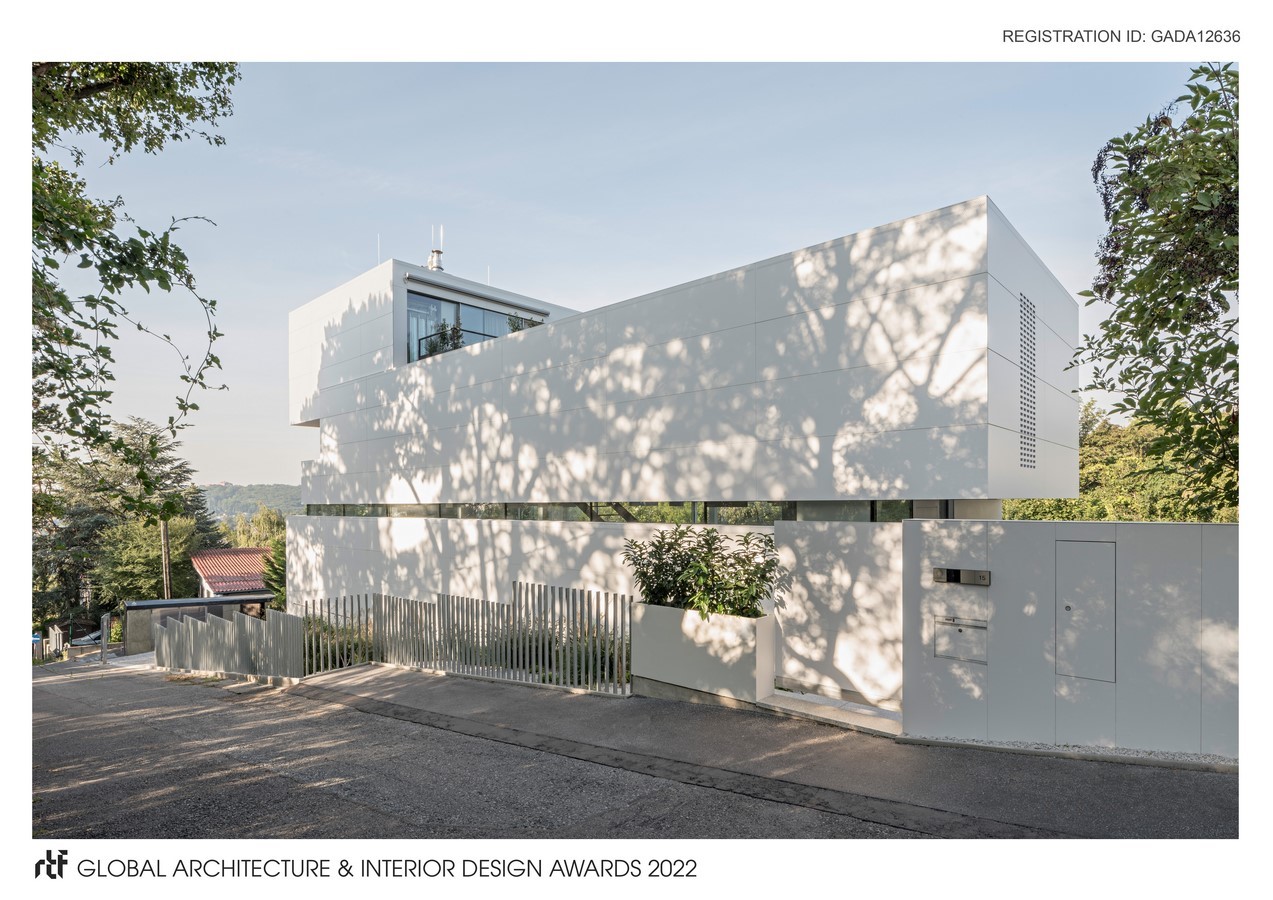 Caramel’s snow-white Corian facade at House Rock contrasts with the surrounding allotment houses, some of which are cheerfully colorful, in a winking manner. At the same time, the smooth, white acrylic stone acts as a projection surface for the shadow play of the surrounding trees.