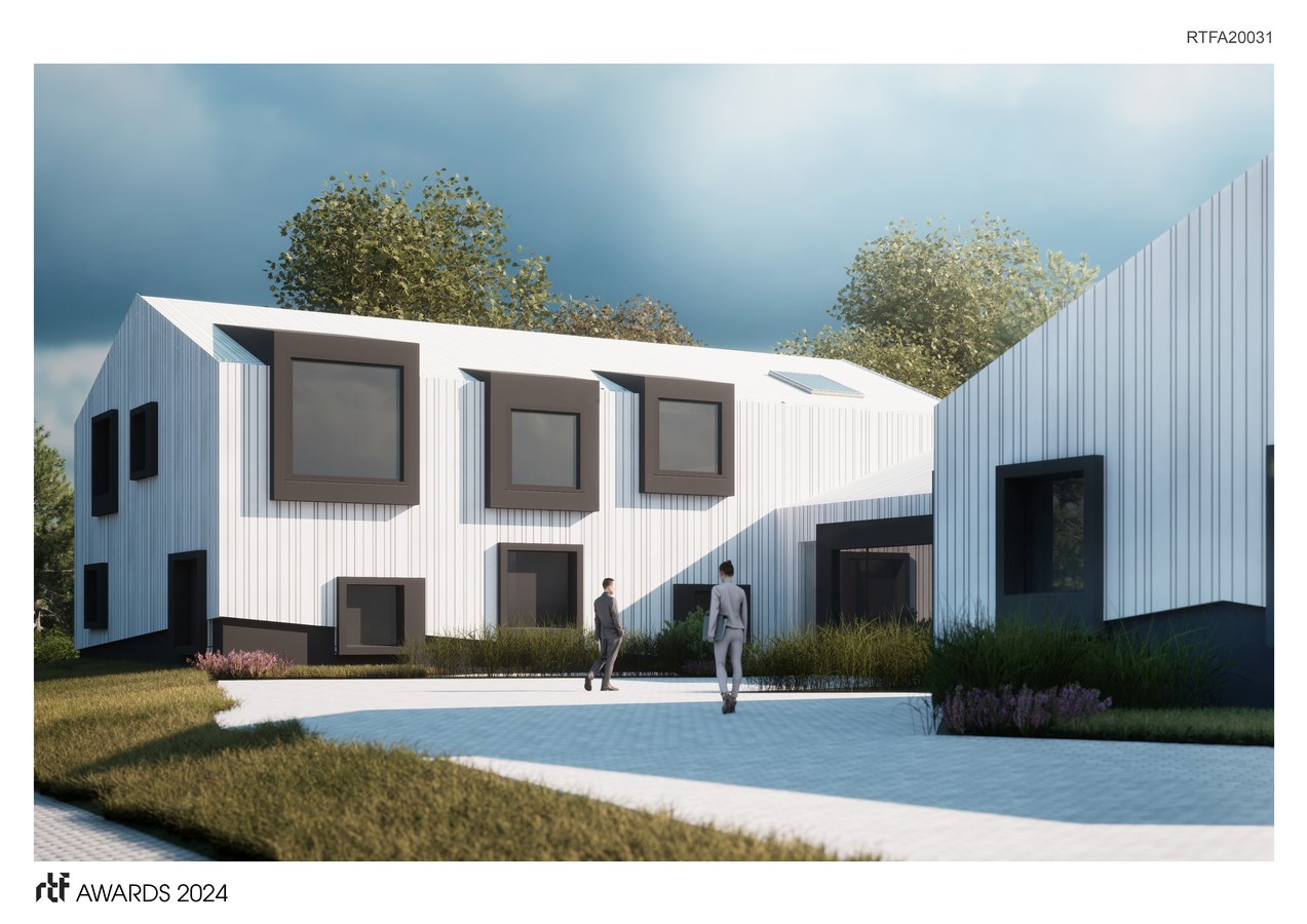 The building is orientated away from the factory, therefore, due to the U-shape, creating a separate, almost private space in front of it. The middle part of the building is the foyer, it is the heart of the building. It features the large meeting room, which can be opened up to the foyer to create a larger space for welcoming larger delegations. The right and left wing of the building each have a distinct purpose – while the right part is spread on two floors and purposed strictly for the offices, administration and all the bureaucratic functions which come with running a factory, the left wing is planned as a low and wide space for the canteen for both the office and factory workers. The canteen can be opened up from both sides of the building to create a open gathering space for the summer months for the workers.