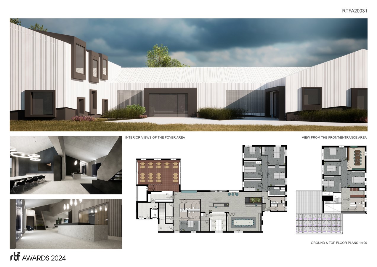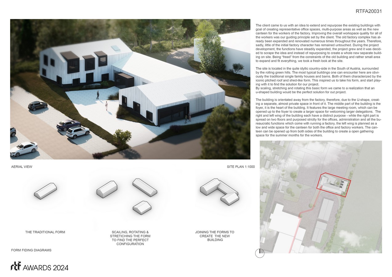The client came to us with an idea to extend and repurpose the existing buildings with goal of creating representative office spaces, multi-purpose areas as well as the new canteen for the workers of the factory. Improving the overall workspace quality for all of the workers was our guiding principle set by the client.