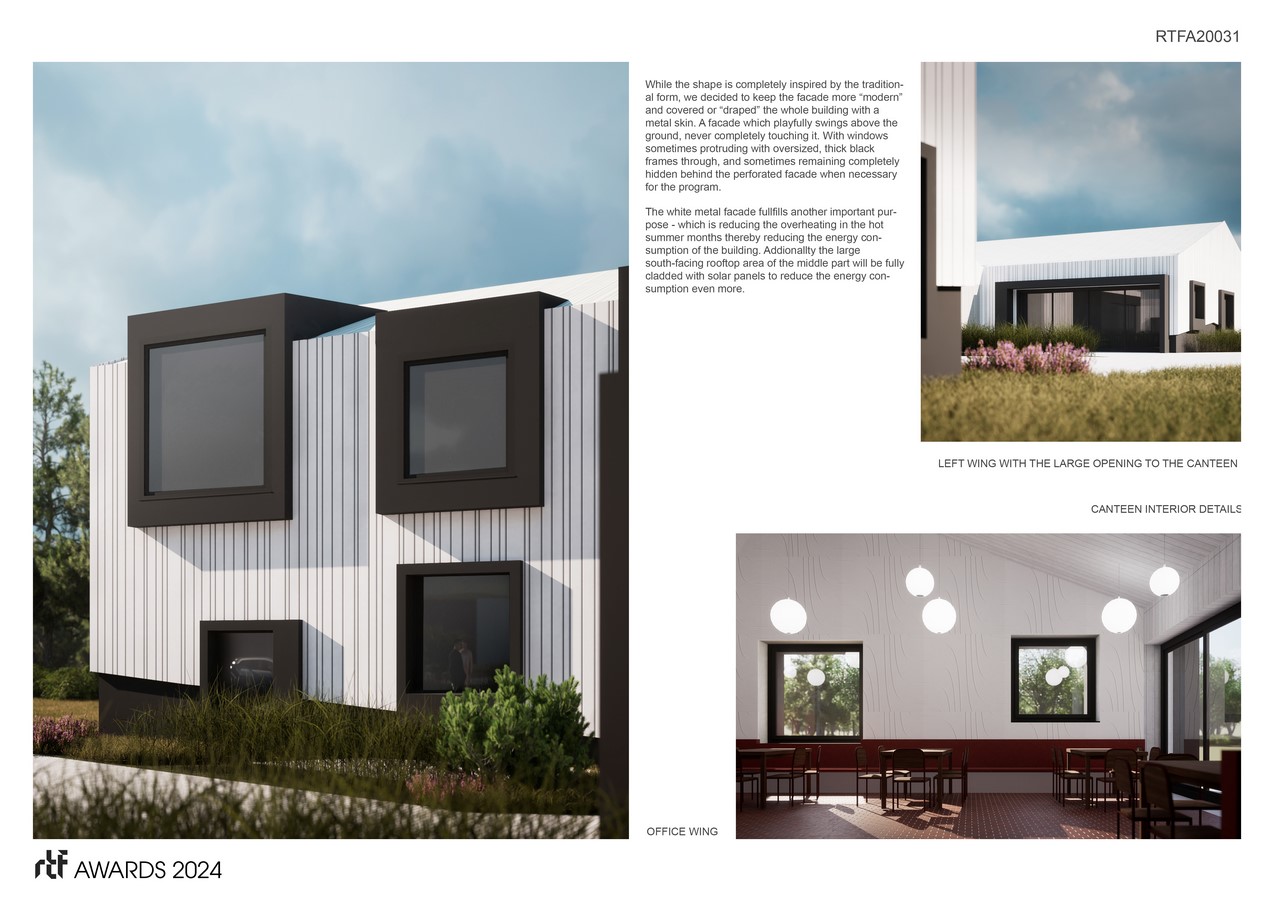 While the shape is completely inspired by the traditional form, we decided to keep the facade more “modern” and covered or “draped” the whole building with a metal skin. A facade which playfully swings above the ground, never completely touching it. With windows sometimes protruding with oversized, thick black frames through, and sometimes remaining completely hidden behind the perforated facade when necessary for the program.