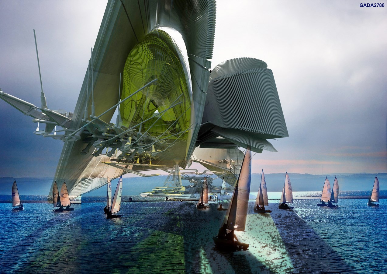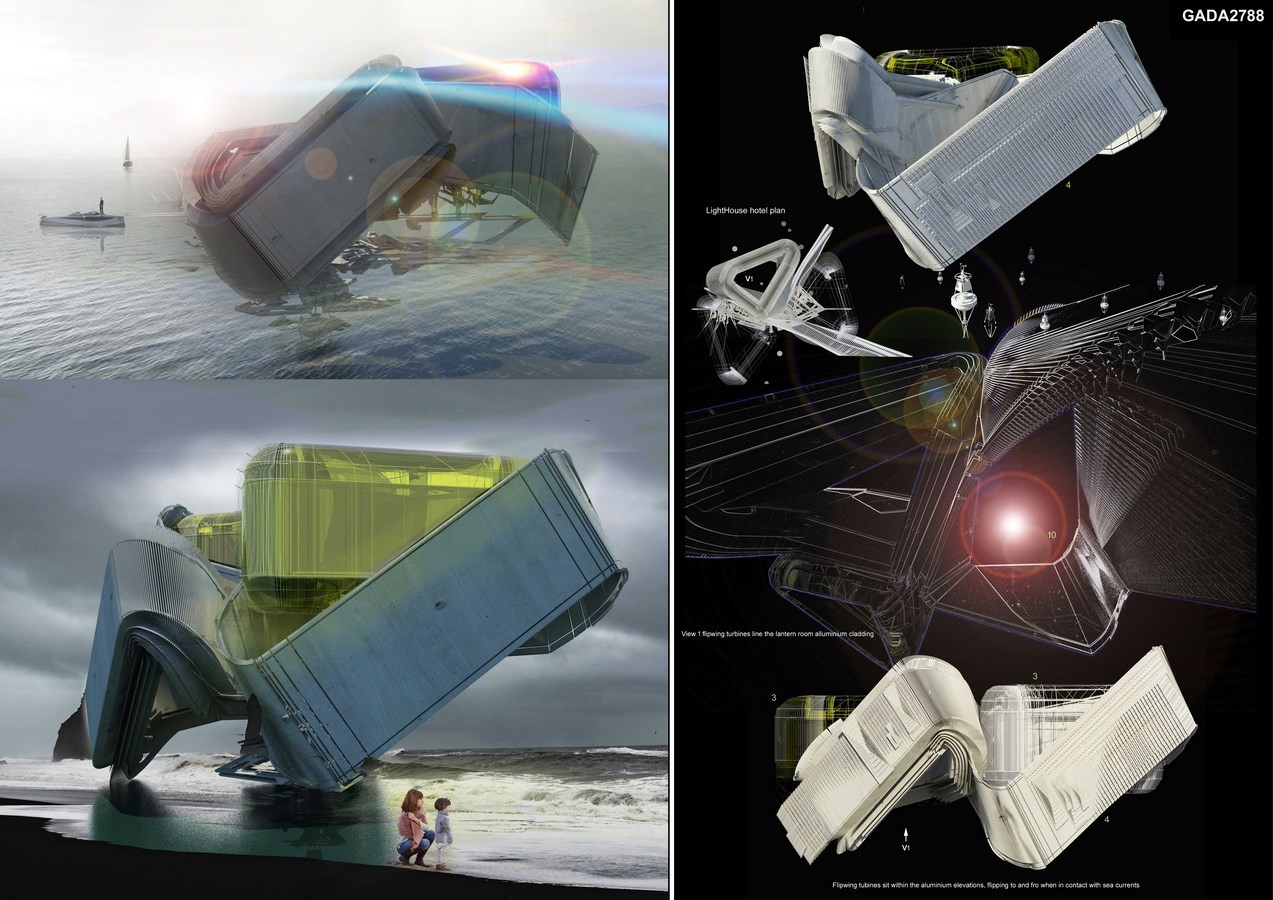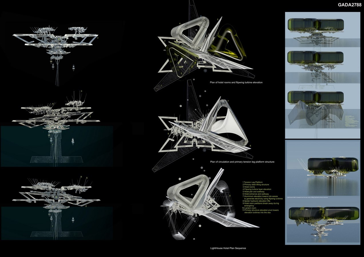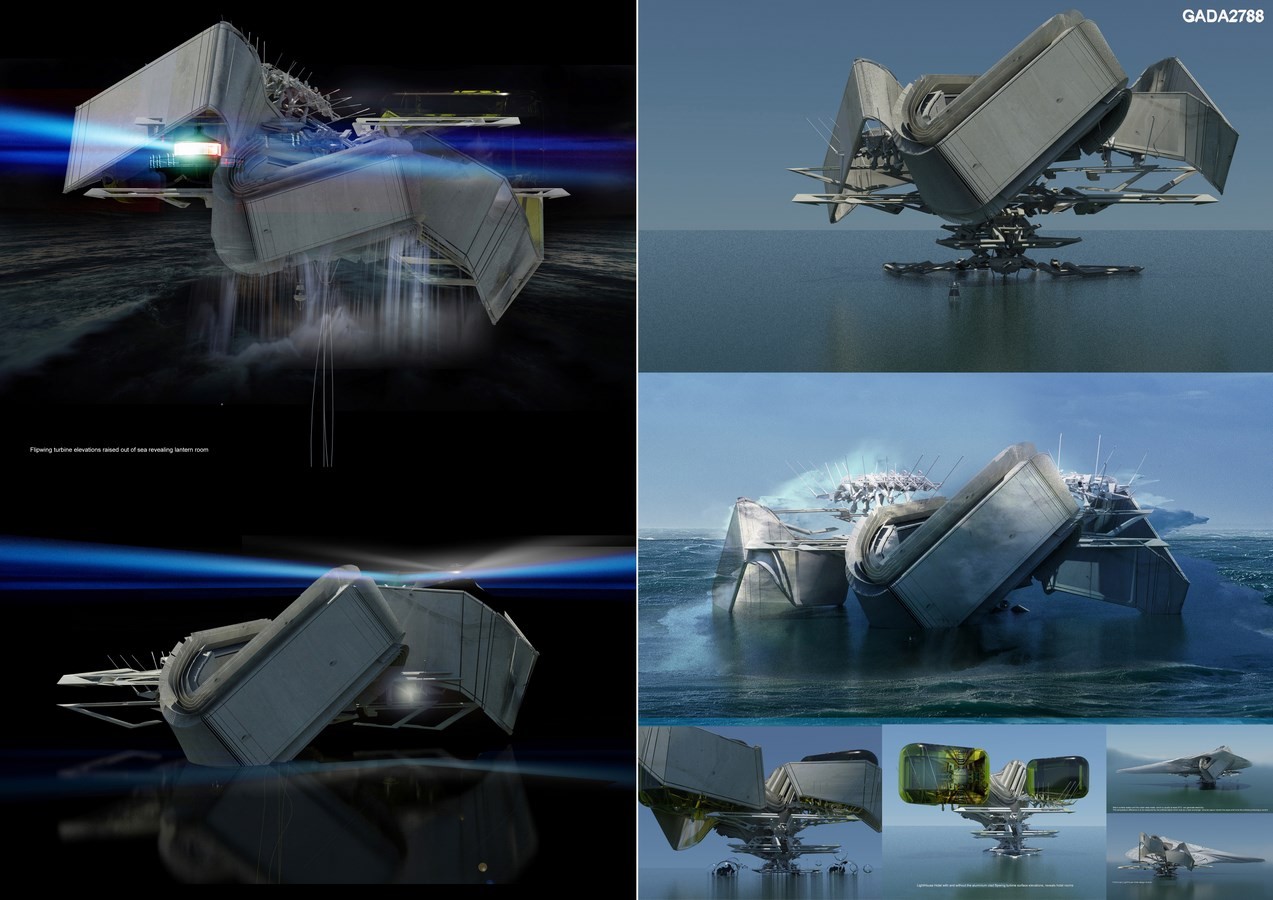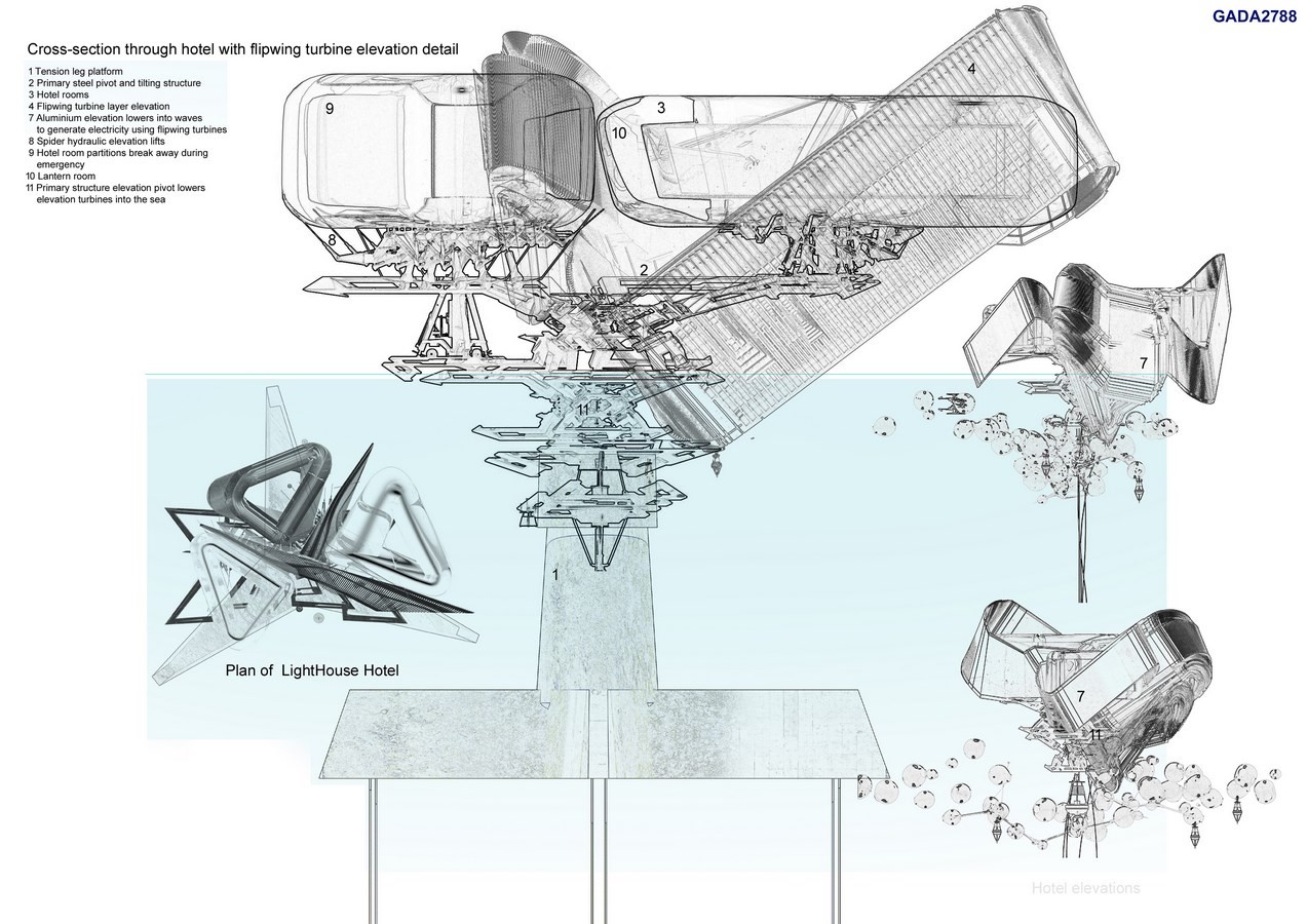 The lighthouse turbine hotel design is made up of three building elements that contain the living and social areas of the hotel. Triple-layered aluminum surface elevations, which are wrapped around the hotels building elements and suspended from the pivot primary structure, enclose flipwing turbines which produce electrical energy when they are lowered into the sea, the water crashes against the aluminium panels and flips the hydropower turbines that are caught. like muscles, between the layers of aluminium clad surfaces. The turbine elevation movements are choreographed by the pivot wheel hydraulic frame section, this pivot wheel is bolted to the main primary structure to reduce fatigue stress caused by changing loads due to movement and load redistribution. The pivot wheel moves and tilts lowering and revolving the elevations according to wind and wave direction for optimum energy output.
