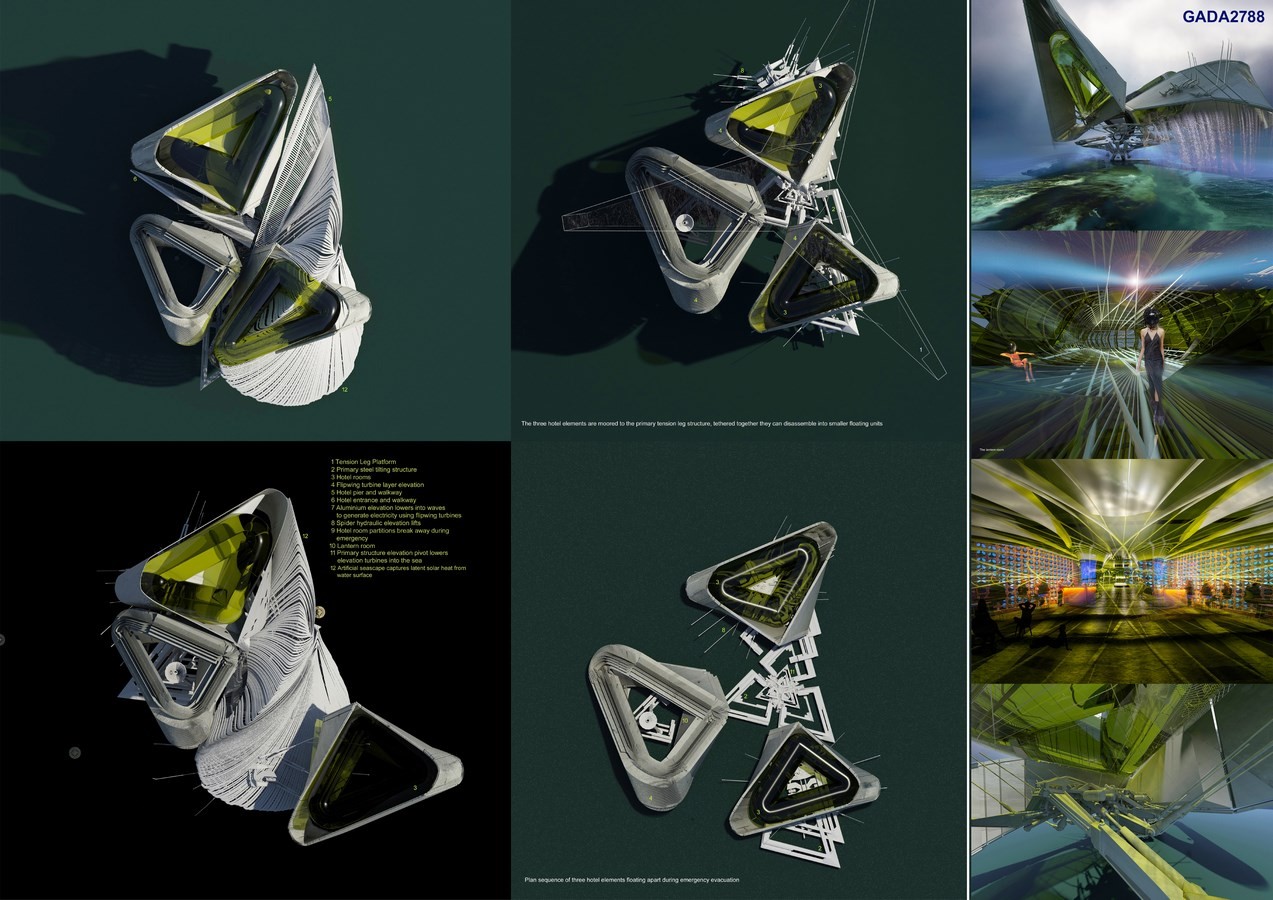 Cassion foundations and gravity anchors secure the tension leg platform so that there is no vertical movement only horizontal displacement which is kept at a minimum, the platform is held in place by steel tension cables embedded into the ocean floor using a gravity anchor. The lantern room, located at the top of the hotel, is revealed when the elevations lower during storms, the Fresnel glass lantern light projects out over the entire area creating an illuminated glass canopy lobby. The refracted light intensifies as it reflects into and out from it’s surroundings blurring the edges between interior and exterior space.