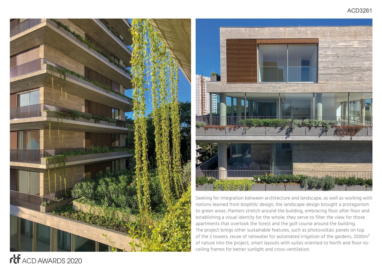 Seeking for integration between architecture and landscape, as well as working with notions learned from biophilic design, the landscape design brought a protagonism to green areas. Planters stretch around the building, embracing floor after floor and establishing a visual identity for the whole; they serve to filter the view for those apartments that overlook the forest and the golf course around the building.