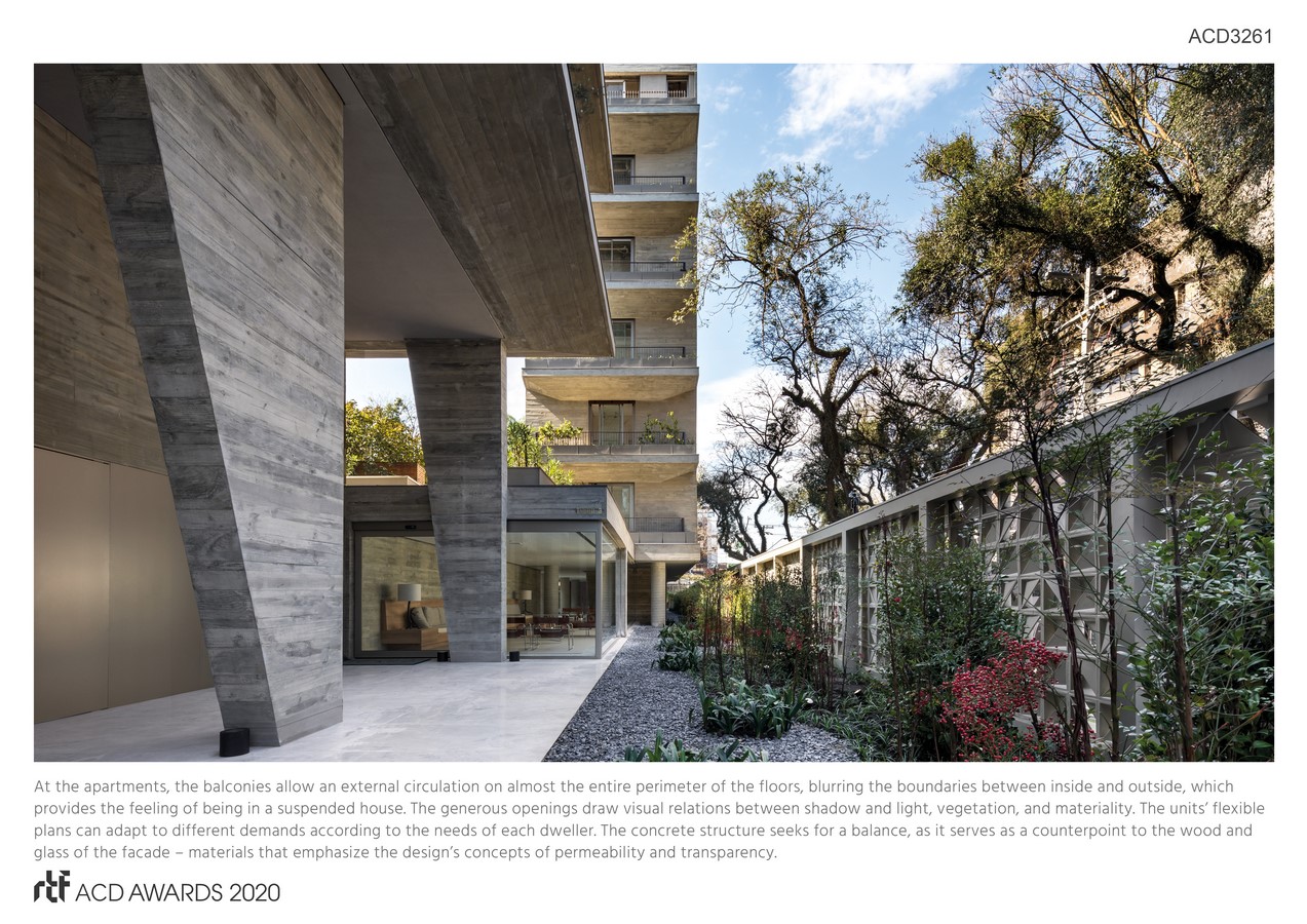 At the apartments, the balconies allow an external circulation on almost the entire perimeter of the floors, blurring the boundaries between inside and outside, which provides the feeling of being in a suspended house. The generous openings draw visual relations between shadow and light, vegetation, and materiality. The units’ flexible plans can adapt to different demands according to the needs of each dweller.