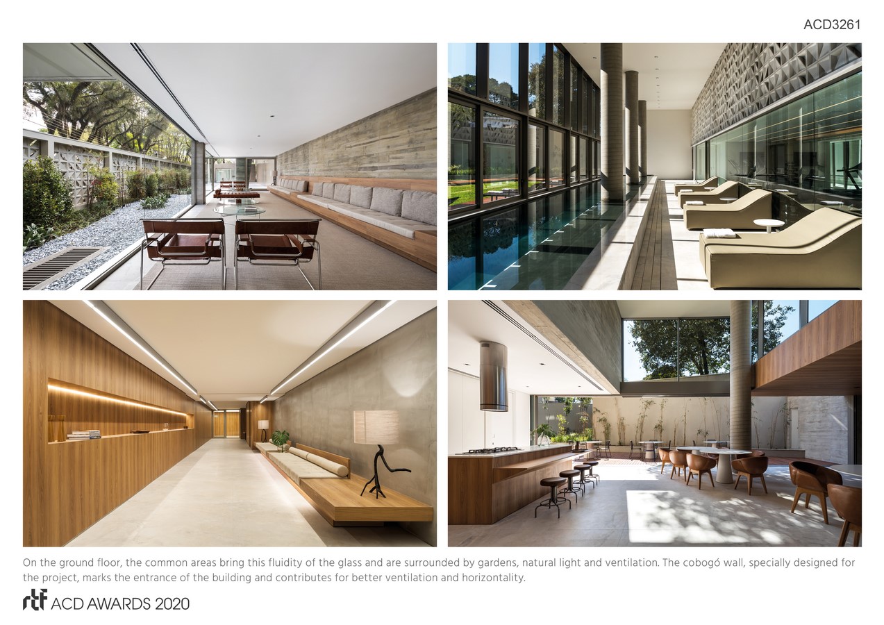 On the ground floor, the common areas bring this fluidity of the glass and are surrounded by gardens, natural light and ventilation. The cobogó wall, specially designed for the project, marks the entrance of the building and contributes for better ventilation and horizontality of the project.