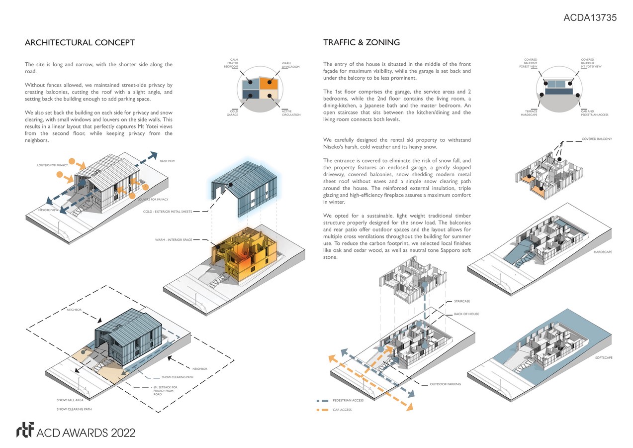 We also set back the building on each side for privacy and snow clearing, with small windows and louvers on the side walls. This results in a linear layout that perfectly captures Mt Yotei views from the second floor, while keeping privacy from the neighbors.