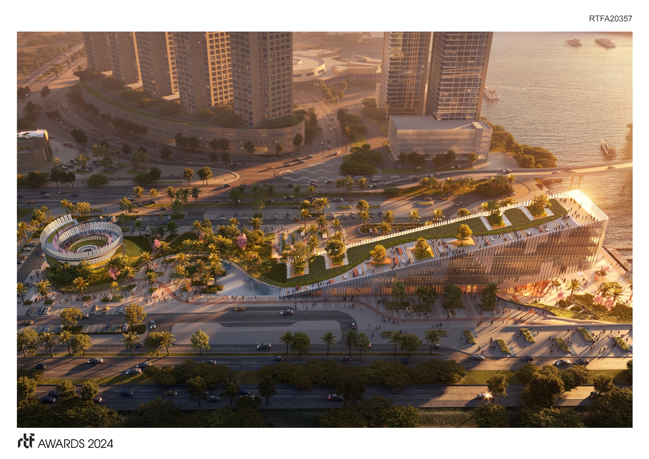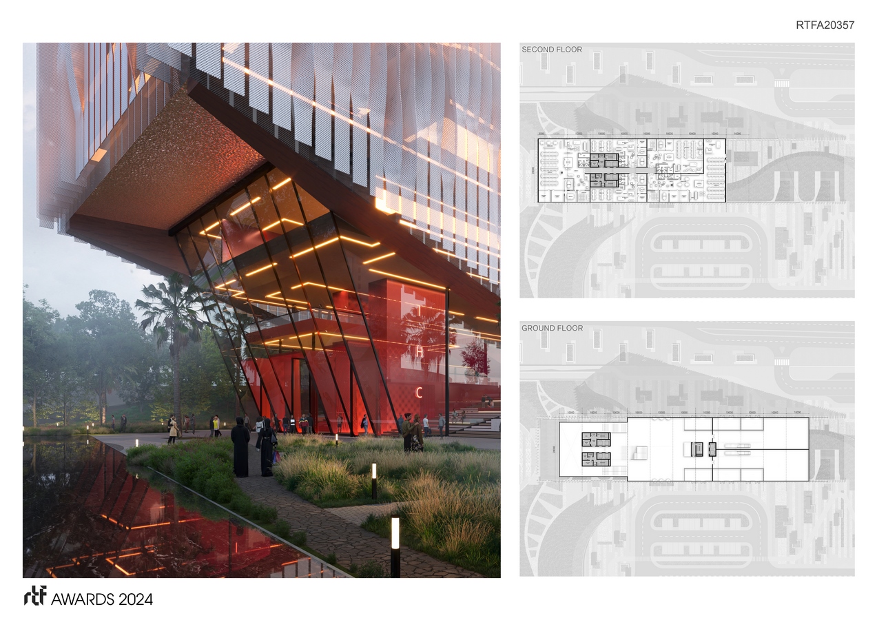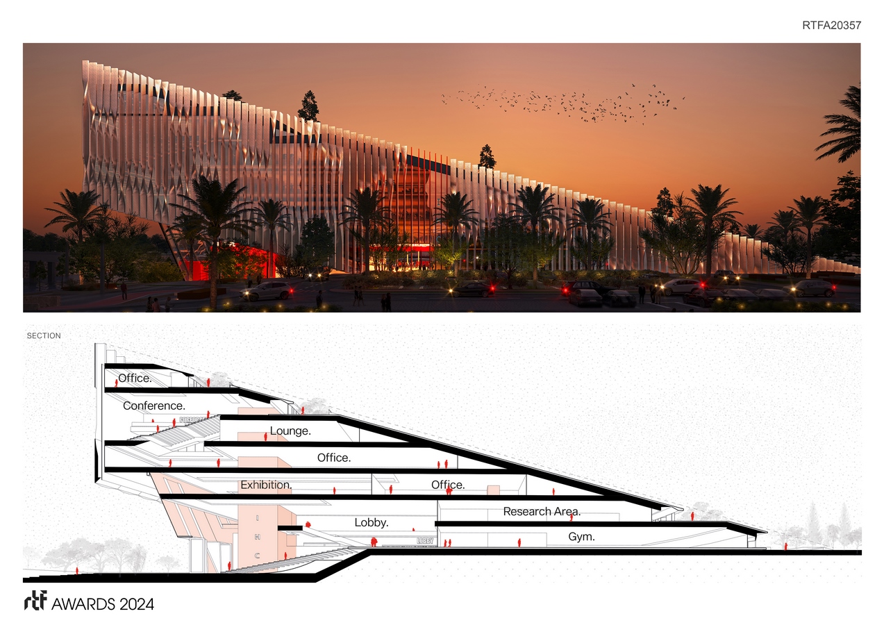 Complementing the office building are vibrant green parks and communal spaces, strategically interspersed throughout the site. These lush oases provide employees with opportunities for relaxation, recreation, and social interaction, fostering a sense of community within the workplace. But what truly sets it apart is its dedication to promoting an active lifestyle. A network of cycling tracks, intricately woven throughout the site, encourages employees to embrace sustainable modes of transportation. The cycling track not only connects various parts of the project but also serves as a unifying element, tying the entire development together in a cohesive and functional manner. Central to the design approach is the concept of the promenade. Elevated above the bustling streets below, the rooftop promenade offers a tranquil escape from the urban hustle and bustle. The rooftop is used as slow circulation to remind us to slowdown in the fast-paced industry while also promoting sustainability. Workers can unwind, engage in physical activity, or simply enjoy panoramic views of the surrounding landscape while having direct access to the rooftop from various terraces. Moreover, the promenade serves as a social and communal space, hosting outdoor events, exhibitions, and gatherings. Whether it’s a yoga session at dawn or a sunset picnic with colleagues, the promenade fosters a sense of belonging and well-being among employees. Incorporating sustainable design principles, it maximizes natural light and ventilation, and utilizes green building materials. Rainwater harvesting systems, slow circulation, and green roofs further minimize the project’s environmental footprint, setting a new standard for eco-conscious architecture in the region. More than just a workplace, it embodies a vision of a sustainable future where nature and technology coexist in harmony. With its innovative design, vibrant community spaces, and commitment to wellness, the IHC HQ redefines the modern office experience, inspiring creativity, productivity, and well-being for generations to come.