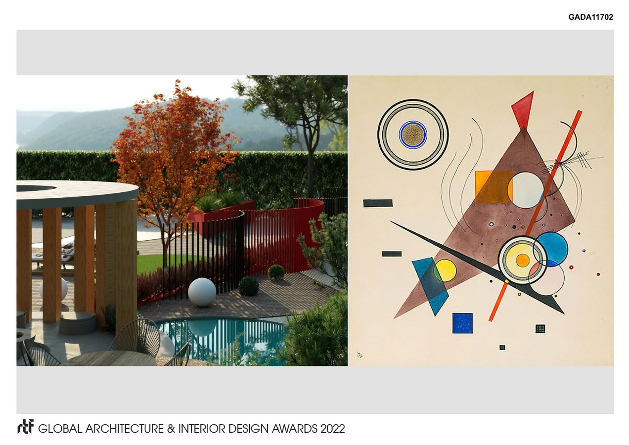 Take as a basis the painting “Composition II” and make it three-dimensional, real, using various modern materials – wood, concrete, metal, plastic and mirrors and add bright, juicy colors. The landscaping uses voluminous, architectural, picturesque trees and clear, straight clipped hedges, there are structural cereals.
