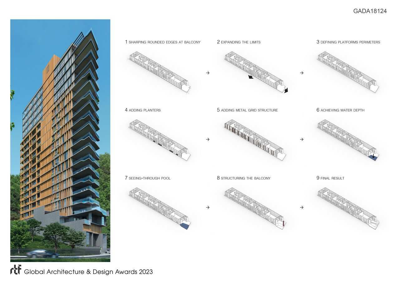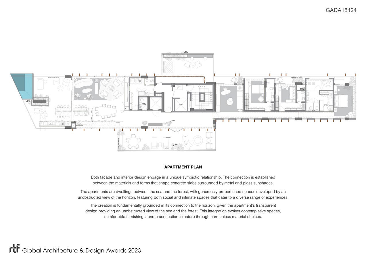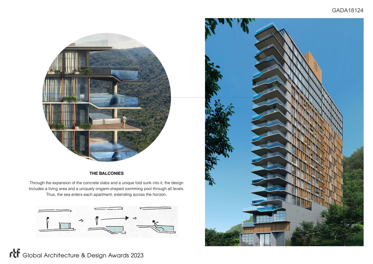 Covered terraces encircle the apartment perimeter in a “U” shape, allowing for unobstructed views and framed by dynamically varying planters in height. The balcony gains more depth to accommodate the pool, with a unique fold sunk into the slab, adjacent to the communal area. Here, the poetics of architecture become unique as the sea penetrates every residence, extending into the horizon. Its distinctive shape resembles origami, and when applied to the concrete slabs to form the pool, it brings lightness and organicity, intrinsically connected to the concept of this development.