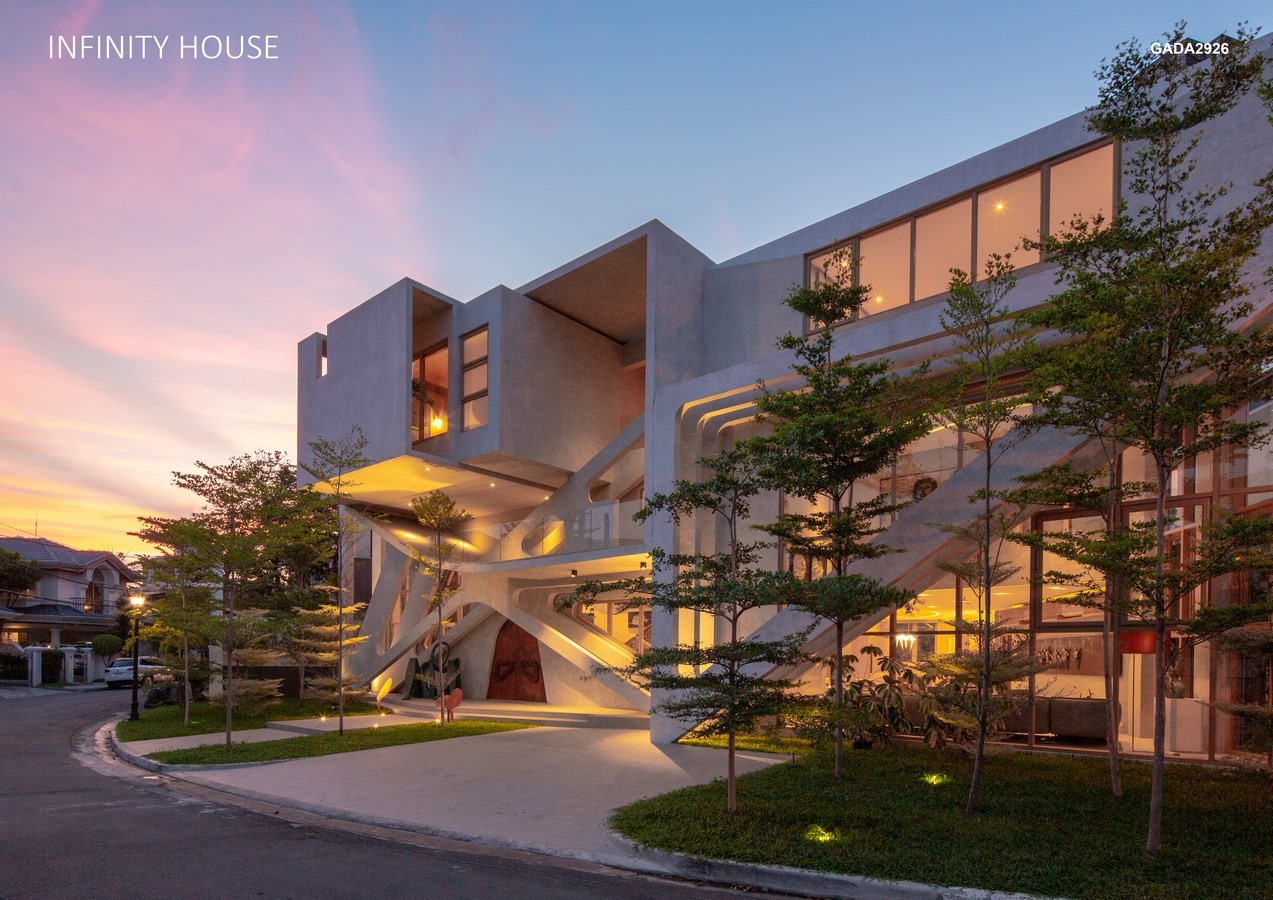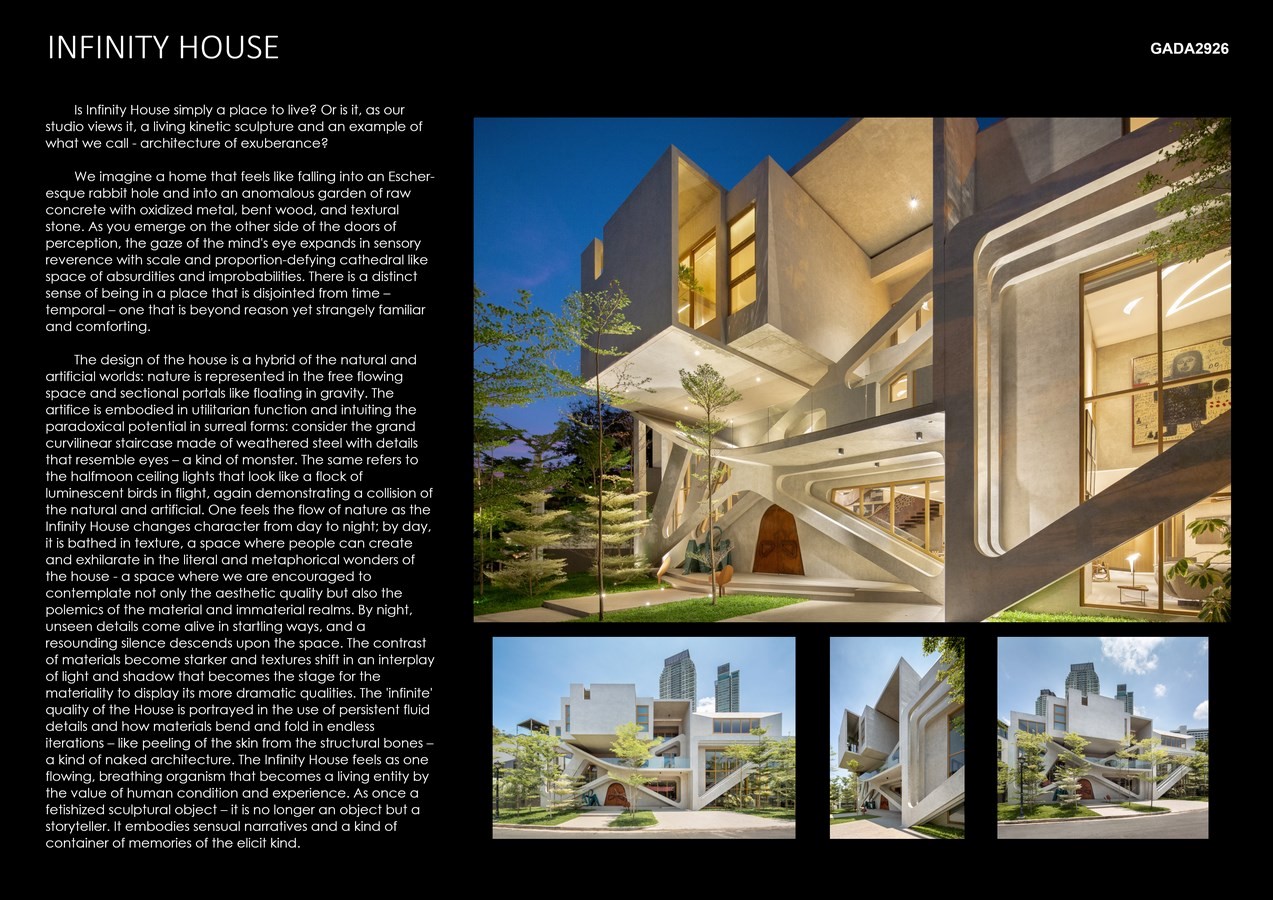 The design of the house is a hybrid of the natural and artificial worlds: nature is represented in the free flowing space and sectional portals like floating in gravity. The artifice is embodied in utilitarian function and intuiting the paradoxical potential in surreal forms: consider the grand curvilinear staircase made of weathered steel with details that resemble eyes – a kind of monster. The same refers to the halfmoon ceiling lights that look like a flock of luminescent birds in flight, again demonstrating a collision of the natural and artificial. One feels the flow of nature as the Infinity House changes character from day to night; by day, it is bathed in texture, a space where people can create and exhilarate in the literal and metaphorical wonders of the house – a space where we are encouraged to contemplate not only the aesthetic quality but also the polemics of the material and immaterial realms.