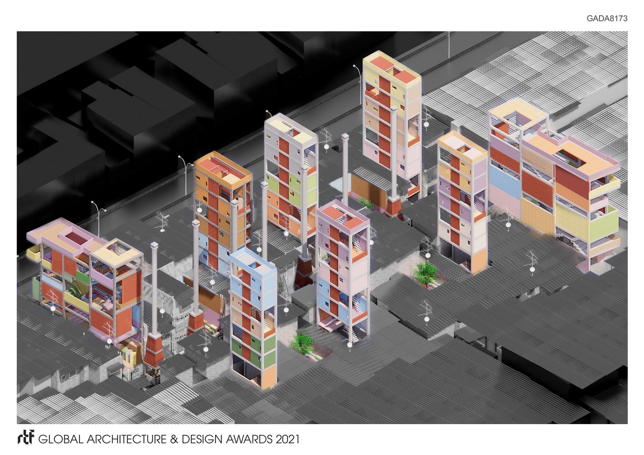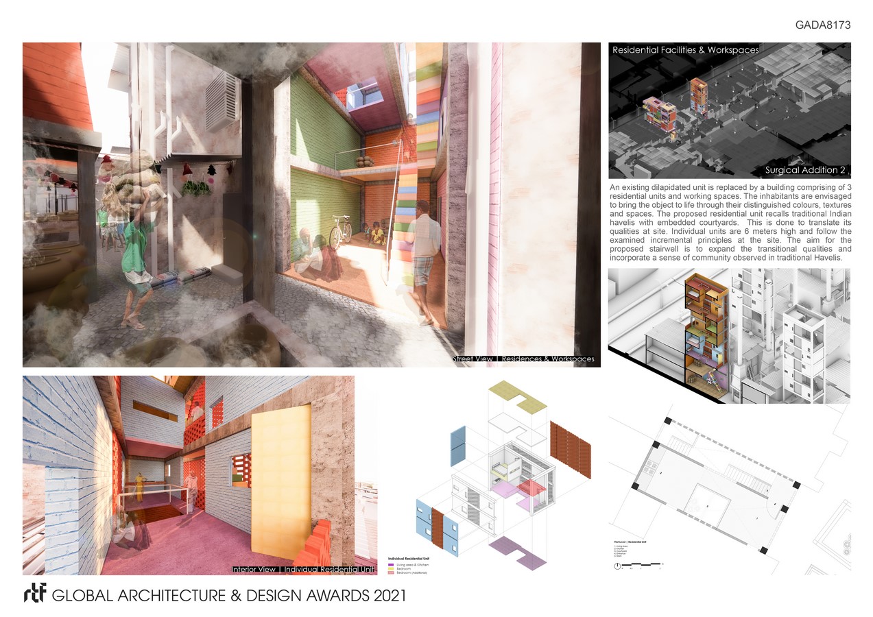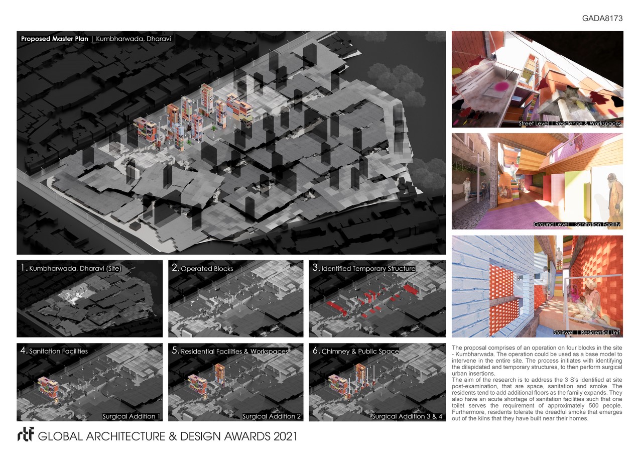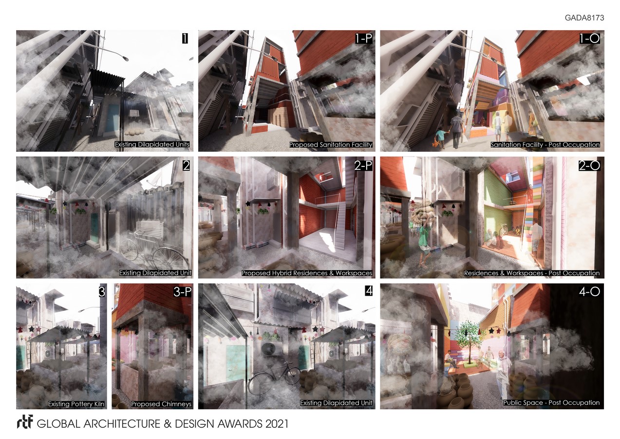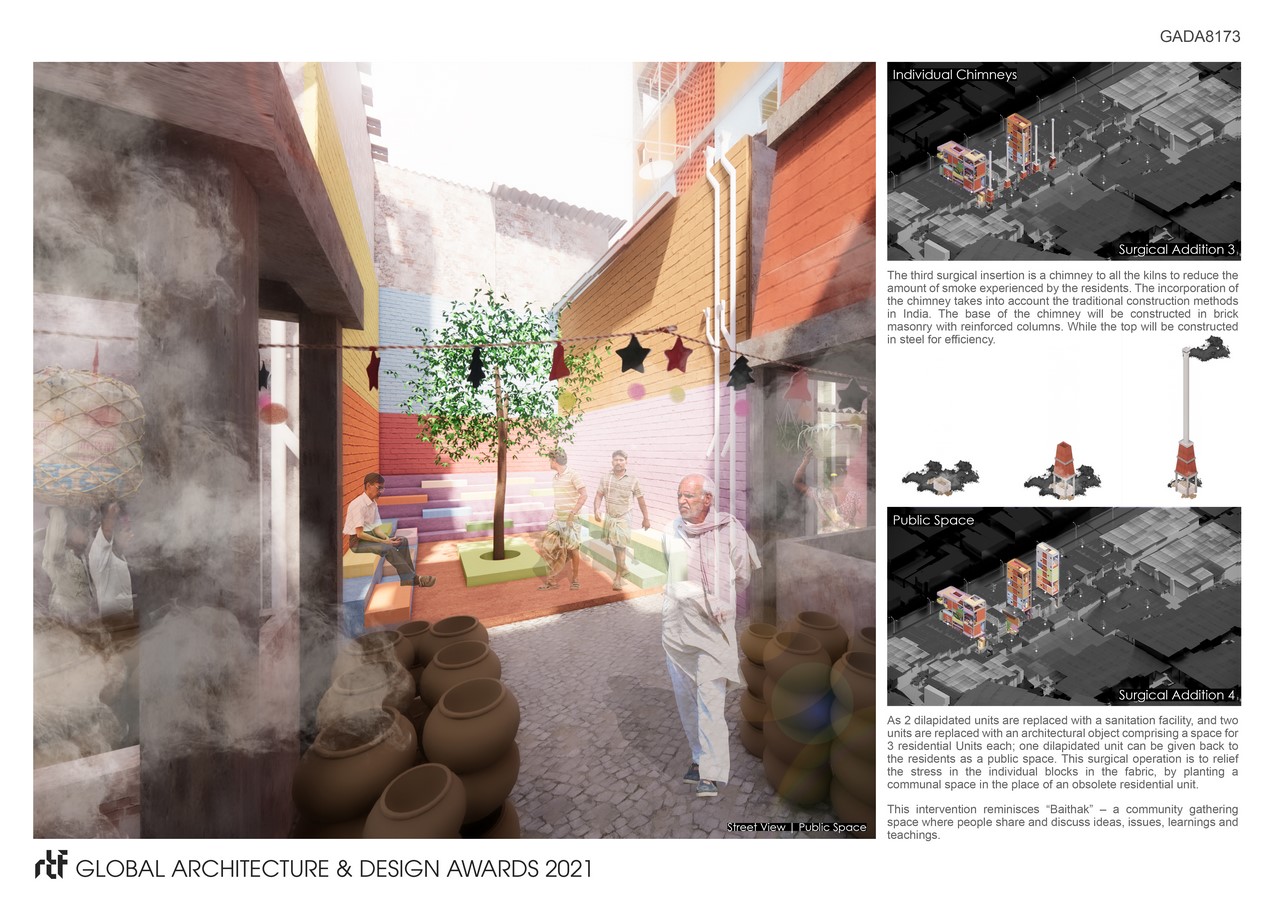 The purpose of this is to enhance the environment for the residents of Kumbharwada, to thrive and prosper. The added objects are Sanitation Facilities reminiscing “Baoli” – Indian Stepwells, Residential Units recalling “Haveli” – Traditional Mansion, Smoke Infrastructures following the traditional construction methods and Public Spaces inspired by “Baithak” – A Communal Space. An eager endeavour is made to not merely address the issues at the site but to formulate an environment that the residents rejoice and relish. The operation is conducted in four blocks of the settlement and proposes “a base model” that can be expanded to all the blocks in the site.