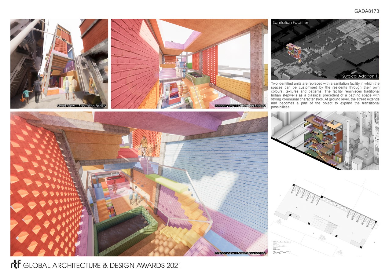 An architectural object is surgically added to provide sanitation facility in the block for the residents, by replacing two identified units. While, the framework of the object is designed to facilitate sanitation, the spaces can be customised by the residents through their own colours, textures and patterns. The facility reminisces traditional Indian stepwells as a classical precedent of a bathing space with strong communal characteristics.