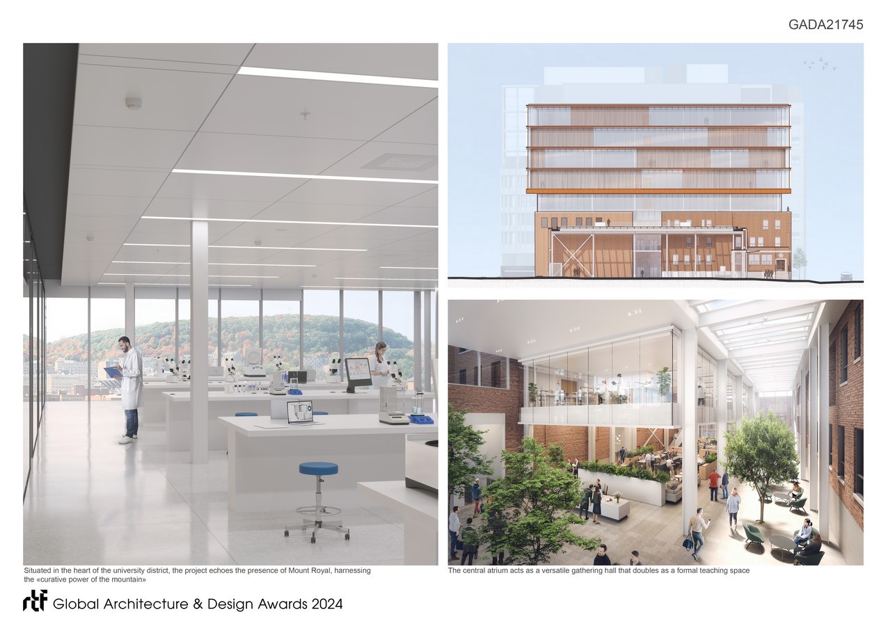 The second phase will bring together researchers and health technology companies in a new nine-storey addition that matches the height of the Clinical Research Institute of Montreal (CRIM), located just to the north. A glazed atrium and rooftop garden will create a simplified, light massing that will expand and frame views to the mountain, create a common meeting point and provide teaching spaces for the growing life sciences community.