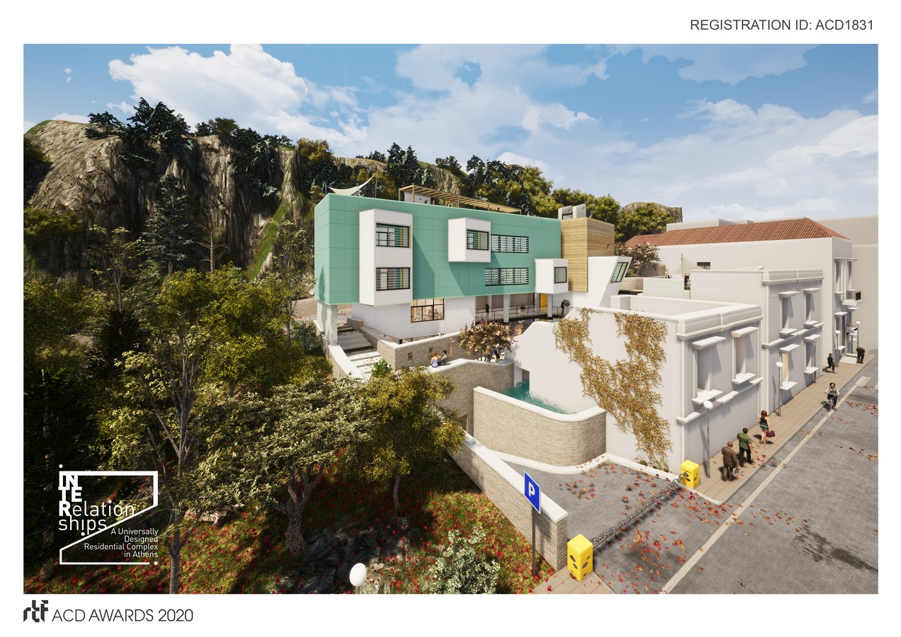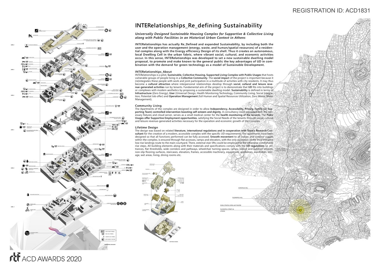 INTERelationships is a pilot, sustainable, collective housing, supported living complex with public usages that hosts vulnerable groups of people living in a collective community. The social impact of the project is important because it (re)integrates these people with work and joint participation in a multitude of activities with city residents. It may thus become a cultural attraction where interpersonal relationships develop through social, cultural and leisure revenue-generated activities run by tenants.
