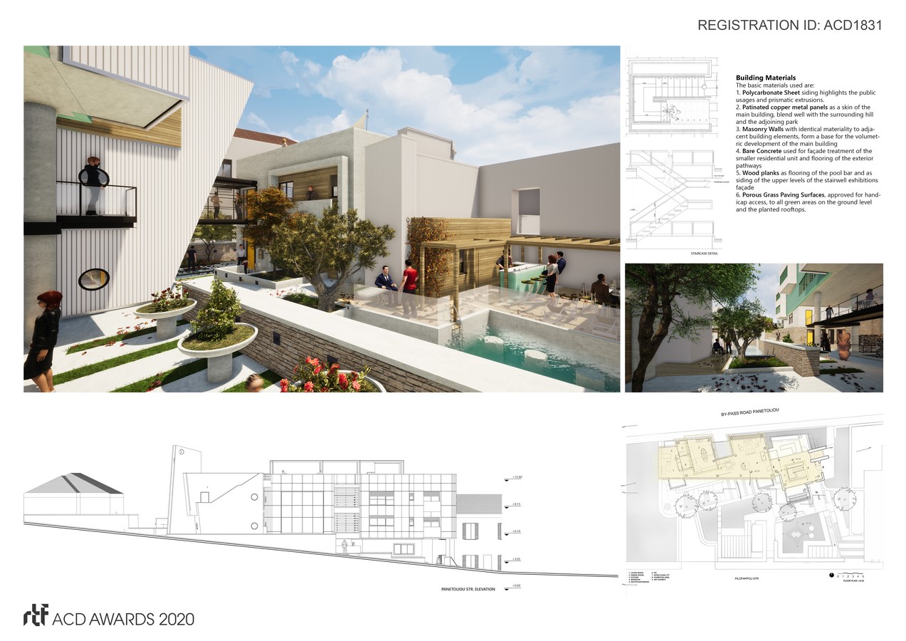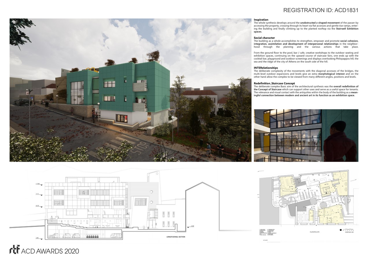 The whole synthesis develops around the unobstructed z-shaped movement of the passer-by accessing the property, crossing through its heart via flat accesses and gentle rise ramps, entering the building and finally climbing up to the planted rooftop via the Stairwell Exhibition spaces. Scrupulous combination of circulation and resting areas offers relaxation opportunities. The passerby may cross the heart of the complex, make a short stop, cool and continue their course, thus contributing to the complex social character.