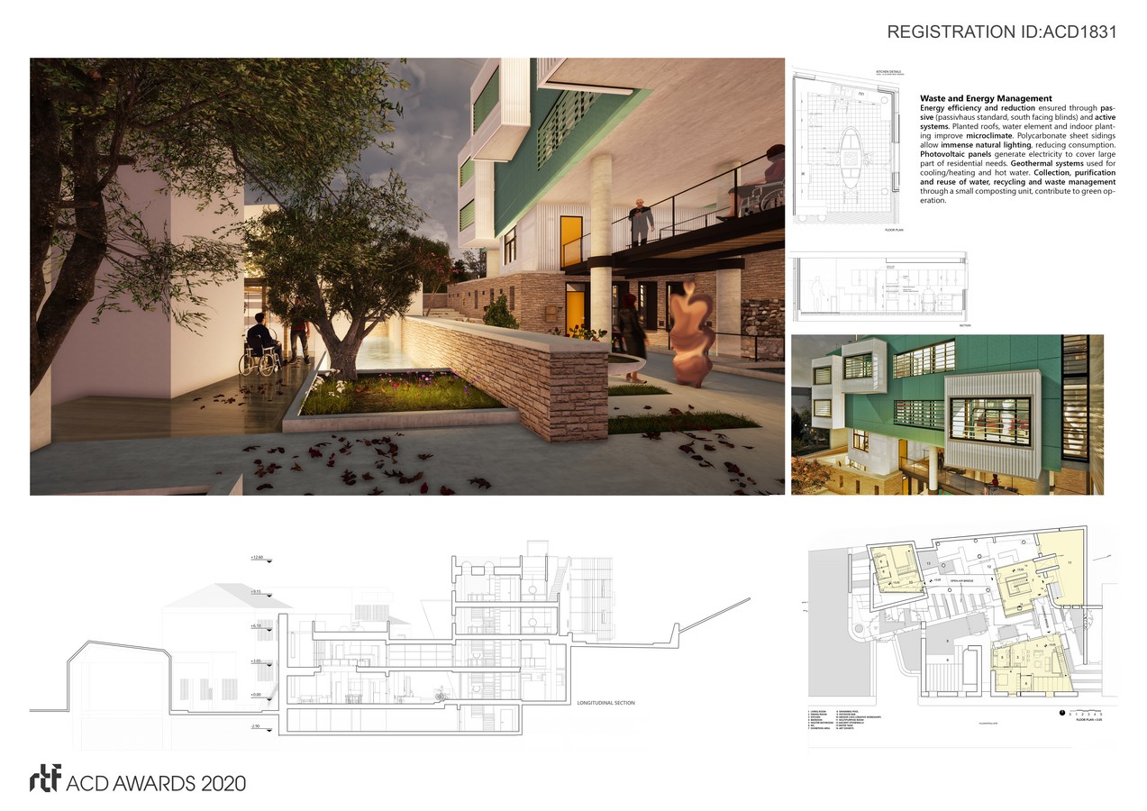Fundamental aim of the project is to demonstrate that UD fits into buildings or complexes with modern aesthetics by proposing a sustainable dwelling model. Sustainability is defined in terms of Infrastructure (Zero Energy), User (Universal Design, Health Monitoring Technology, Community Living, Social Integration, Potential Job offer) and Operation Management (full Human and Spatial Resources Utilization, Zero Waste, Water Management).