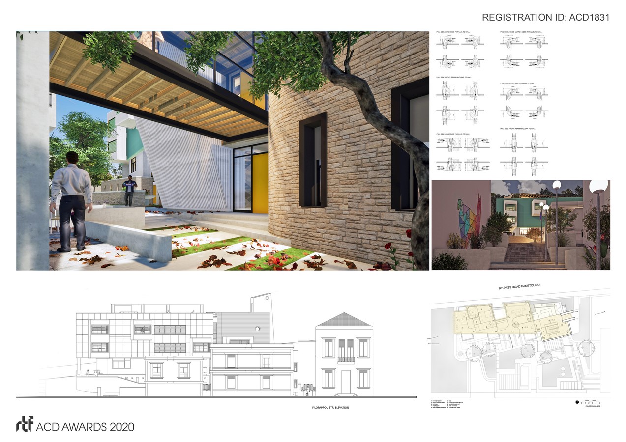 As part of this development and growth, different typologies of services are incorporated, beginning with group homes, foster care, and then a variety of new and innovative services such as early intervention, family support services, supportive living and “related services” (e.g., supported employment, supported housing). The Apartments of the complex are designed in order to allow Independency, Accessibility, Privacy, Family (or Supporting Team) controlled intervention boosting self-esteem and dignity. A consultancy room equipped with the necessary fixtures and cloud server, serves as a small medical center for the health monitoring of the tenants. The Pubic Usages offer Supportive Employment opportunities, satisfying the Social Needs of the tenants through social, cultural and leisure revenue-generated activities necessary for the operation and economic growth of the Complex.
