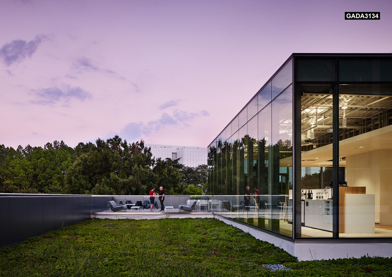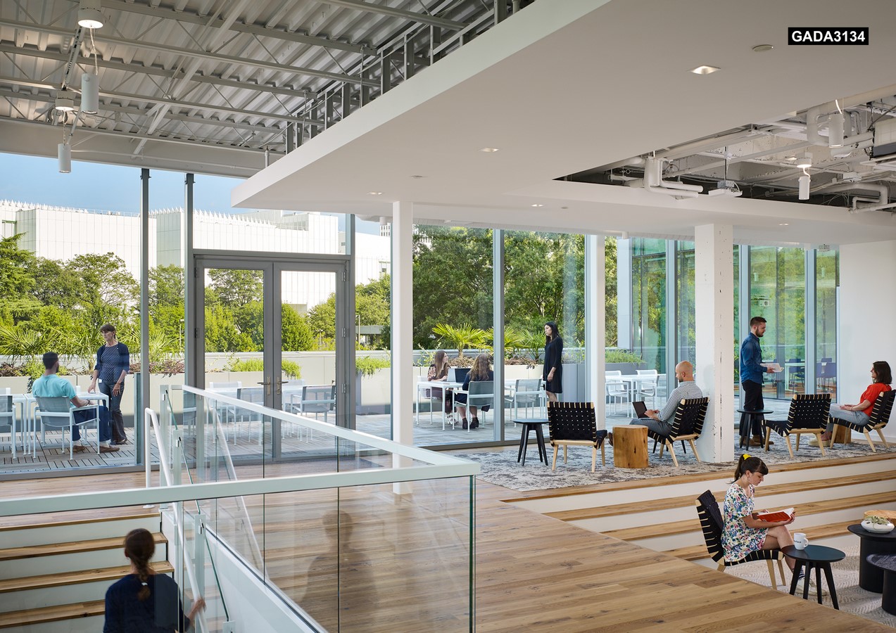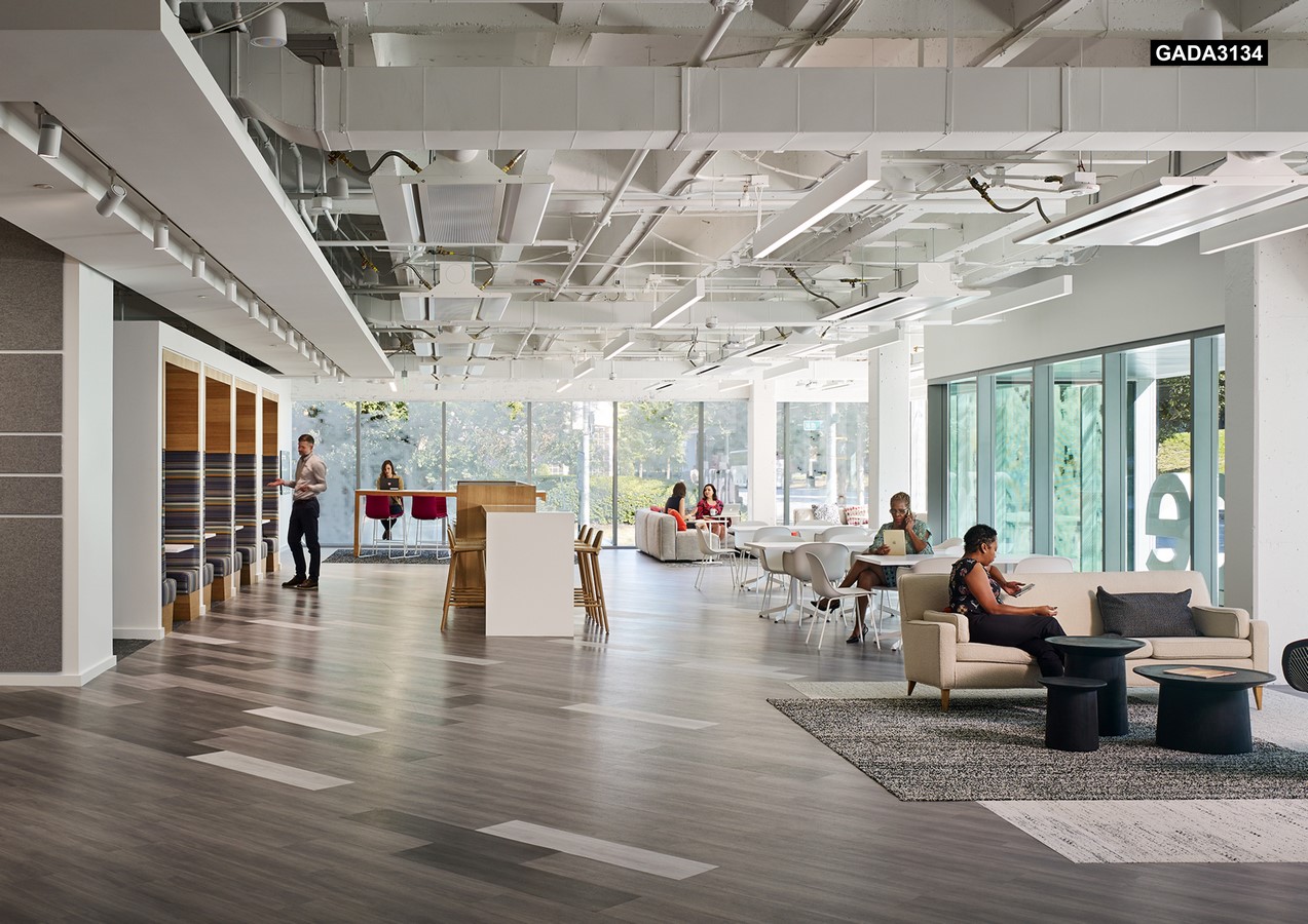 Inside, new high-performance HVAC and lighting systems reduce the building’s total energy use by over 50% compared to typical office buildings, while the rainwater from the cistern eliminates the need for municipal water for restrooms or landscape irrigation. Additionally, wellness and “restoration rooms” are available for employee relaxation and meditation. To ensure relevance well into the future, the design is easily adaptable and changeable, including movable furniture, flexible seating, and of course, modular flooring. The completed project will earn LEED Platinum and WELL Gold Certification.