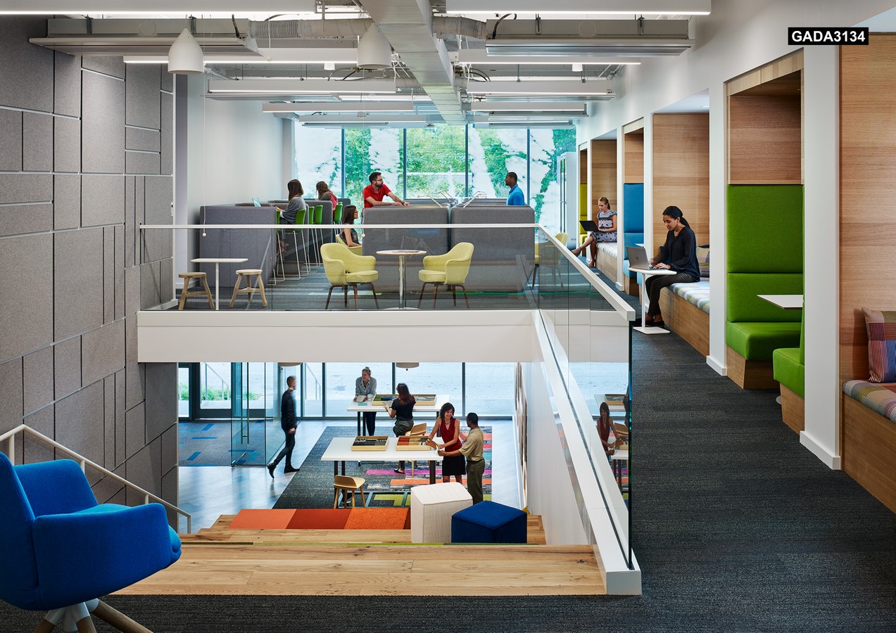 Building on Interface’s leadership in sustainability, this design looked to nature for inspiration. It incorporates Biophilic design as a key focus throughout, ensuring that occupants have a clear connection to the natural world, through the conceptual metaphors of a Cave, a Forest and a Bluff. Sited on a natural rocky ridge in the city, the lowest “Cave” levels house the refurbished parking garage, provide electric-vehicle charging and bicycle storage and showcase a 15,000-gallon rainwater cistern. The “Forest” comprises the three floors of existing office structure, each with a unique feel and destination. The “Bluff” consists of the new penthouse featuring the Learning Center, Roof Terrace and green roof where employees enjoy a natural respite with remarkable views. Horizontal and vertical circulation is organized as a continuous journey throughout the building. Along this path are myriad work-choice offerings that also function as product vignettes for Interface, decentralizing the traditional idea of a showroom. Employees are free to work from any location or type of furnishings that best support their tasks or mood.