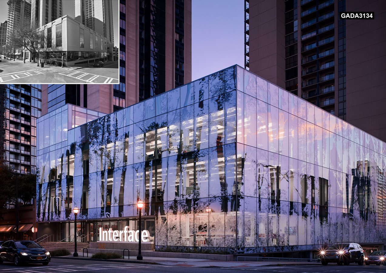 The most striking feature of Interface’s new headquarters is its skin: a high-performance curtainwall with a semi‐transparent polyester sheath, depicting a life‐size forest. The sheath’s square pixel pattern is reminiscent of Interface’s modular flooring systems and draws an unequivocal connection to the site’s natural history of eastern-US Piedmont Forest. Besides creating an iconic presence on its busy corner, the patterned wrap protects against glare and solar heat gain while throwing a soft, dappled pattern on the interior floors.