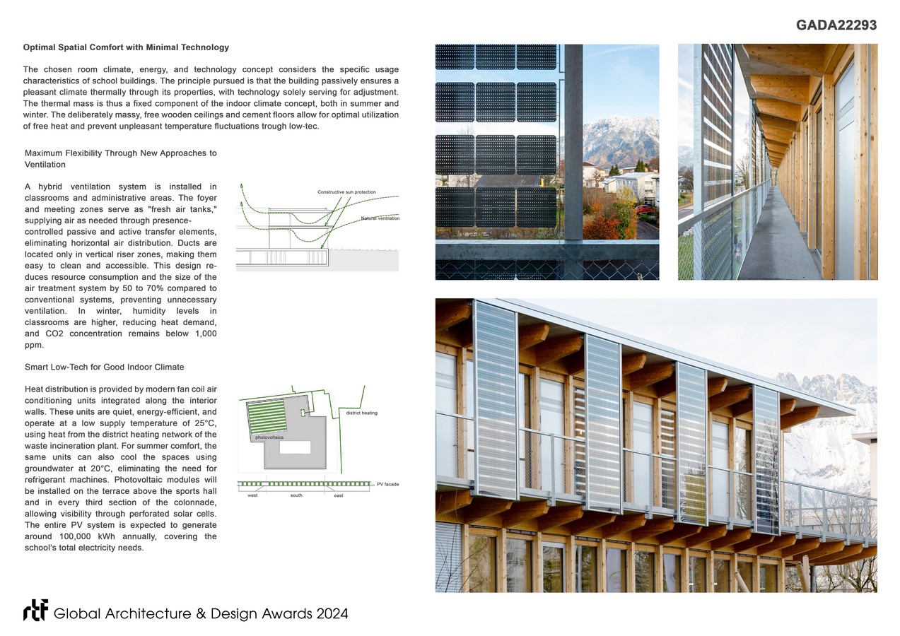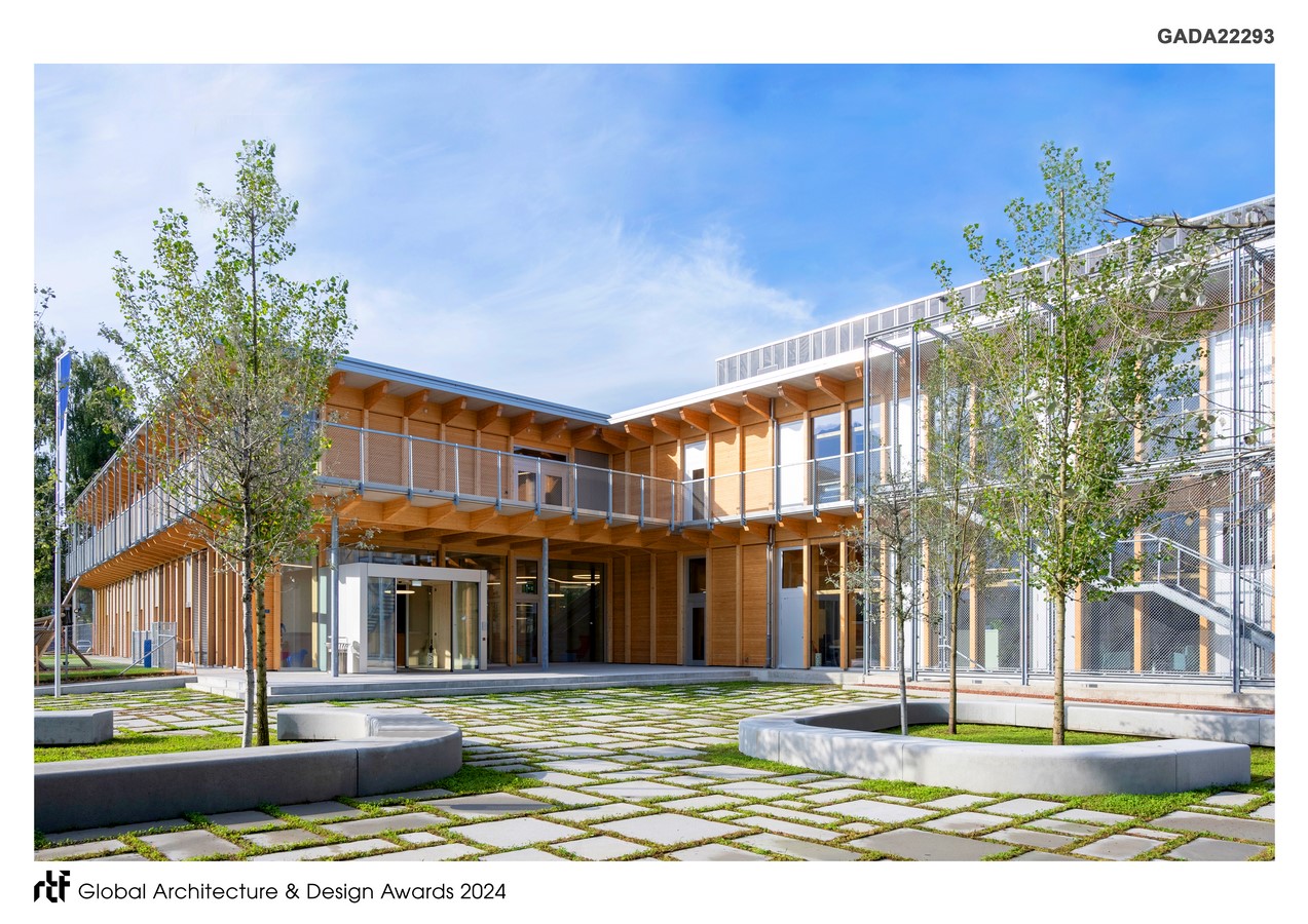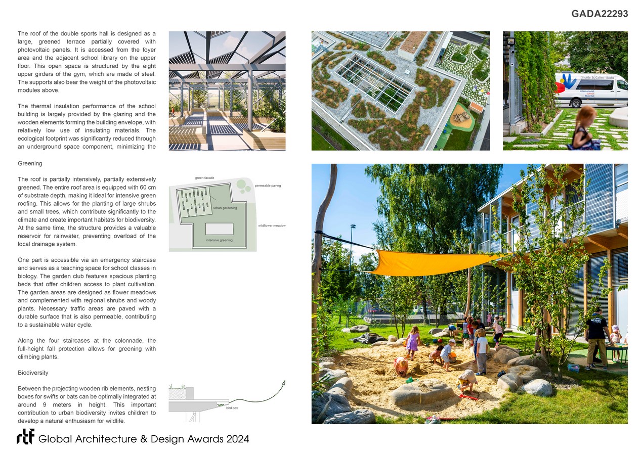 Floor-to-ceiling windows optimize natural light in classrooms, fostering learning and enhancing concentration. The use of regional timber minimizes grey energy and supports the local economy. Overall, the ISR positions itself as a showcase project in the realms of institutional design for compact and flexible school buildings, with facilities such as the sports hall and stage also accessible to community users. It exemplifies sustainable construction utilizing renewable resources, rooftop gardens, biodiversity enhancement, heat reduction strategies, and innovative spatial design through “open learning spaces,” which are not only architecturally appealing but also environmentally friendly and functional.