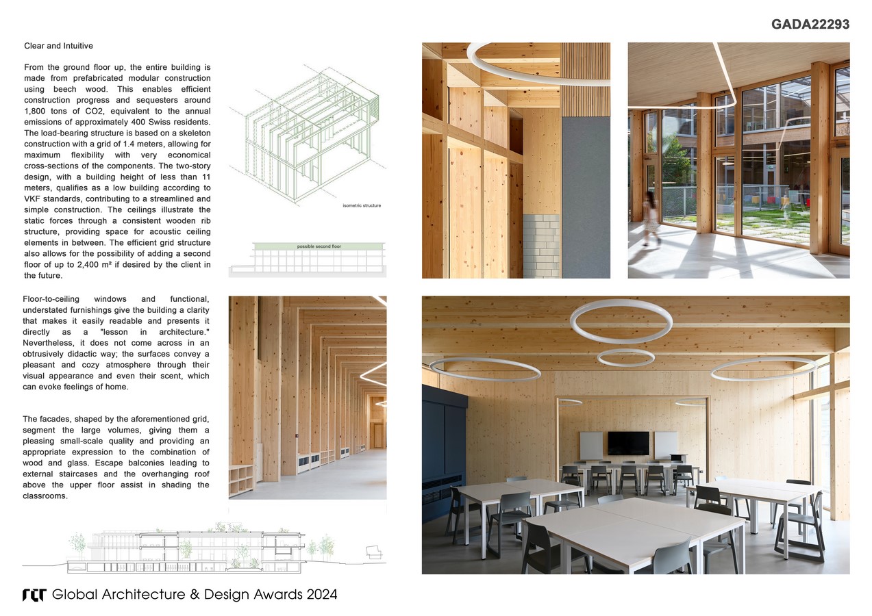 ISR makes a strong statement for sustainability and environmental consciousness. From the ground floor upwards, the entire building is constructed using a prefabricated timber frame system, which not only streamlines the construction process but also sequesters approximately 1,800 tons of CO₂. These eco-friendly measures demonstrate the school’s awareness of its responsibilities toward nature and its active contribution to reducing its ecological footprint.