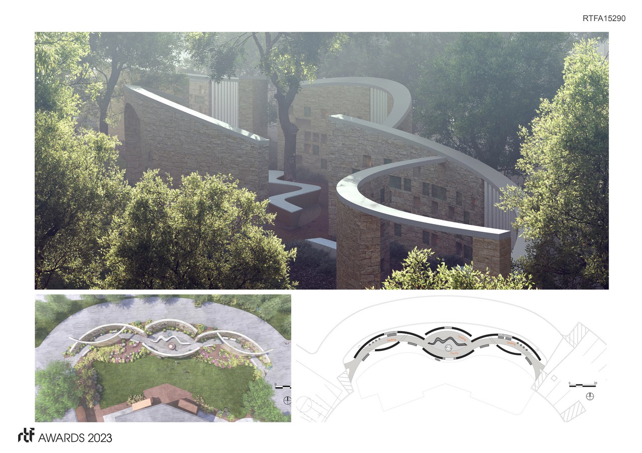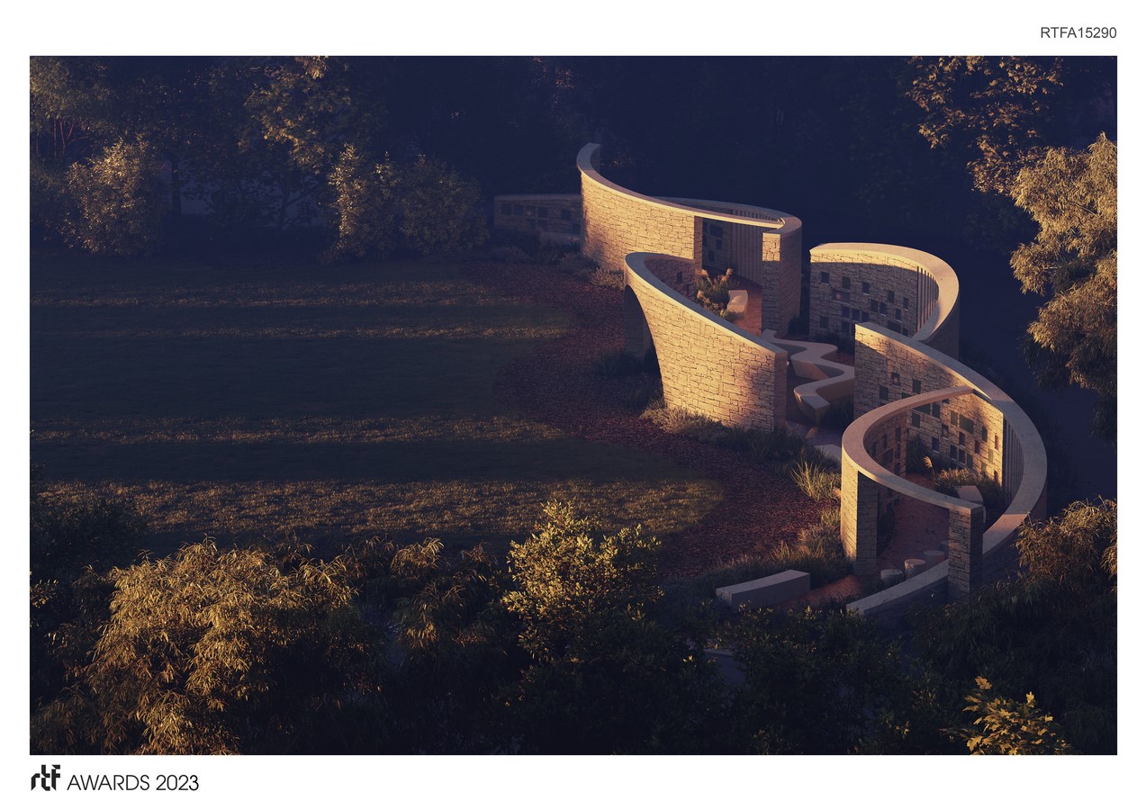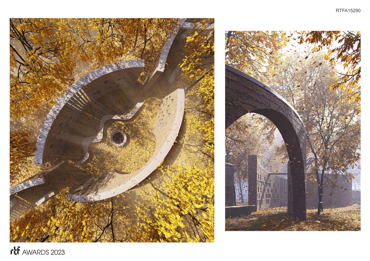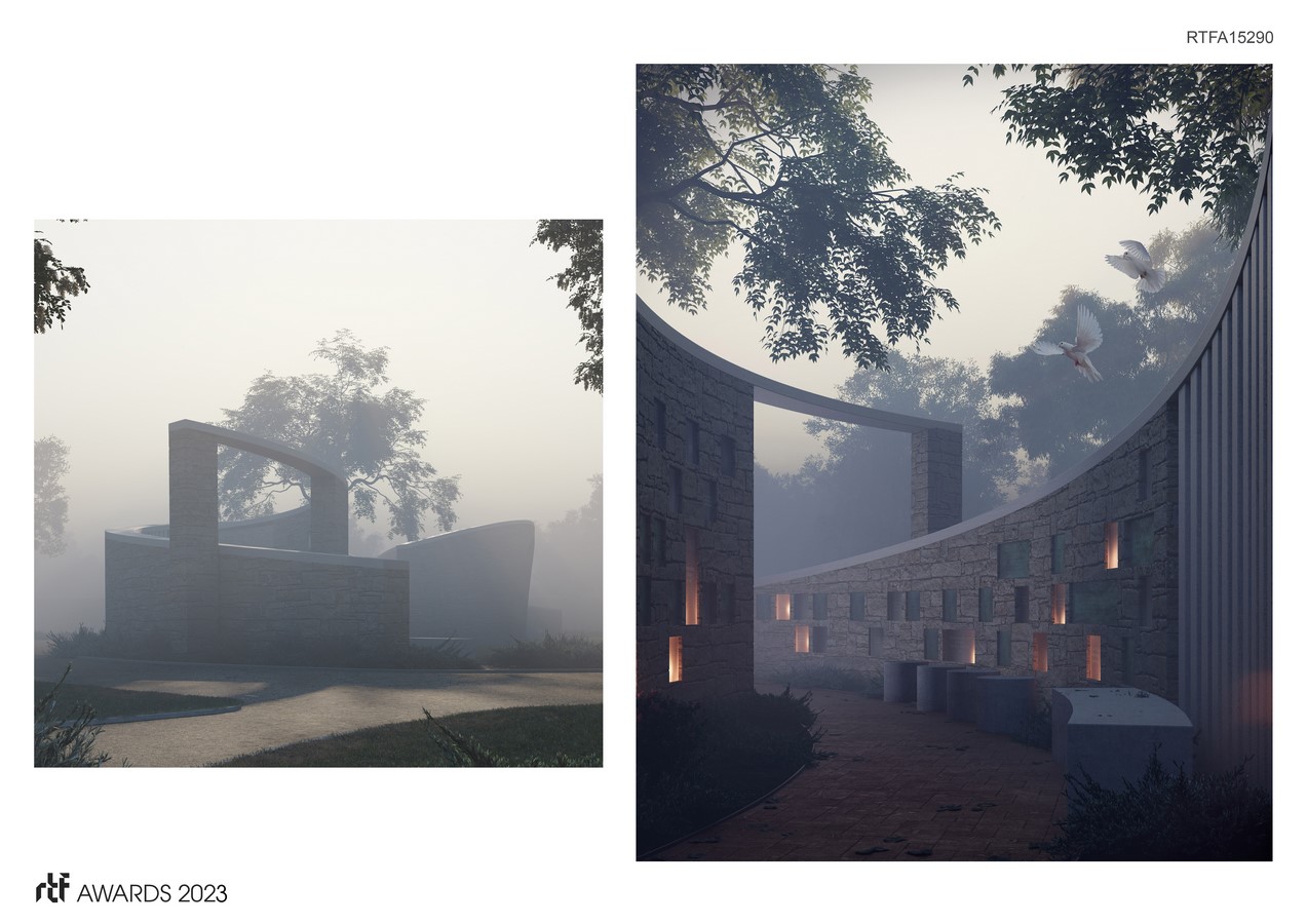 The design approach and vision for Intertwined Eternities, was to show that the dynamic between heaven and earth, between life and death, is an eternal question, unanswerable solely with logic—it requires a combination of an open mind and a gentle heart. The architecture approaches these questions in a meaningful way, turning to symbolism to engage the intellect and emotional experience to spark the imagination. The role of the architecture here invites the participation of the user in a way that asks profound questions, that encourages the user to explore, rather than attempting to provide simple answers to complex issues.
