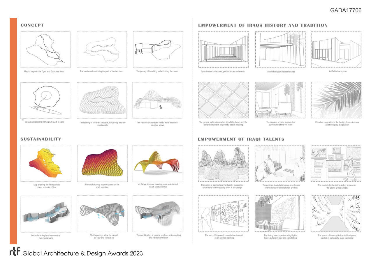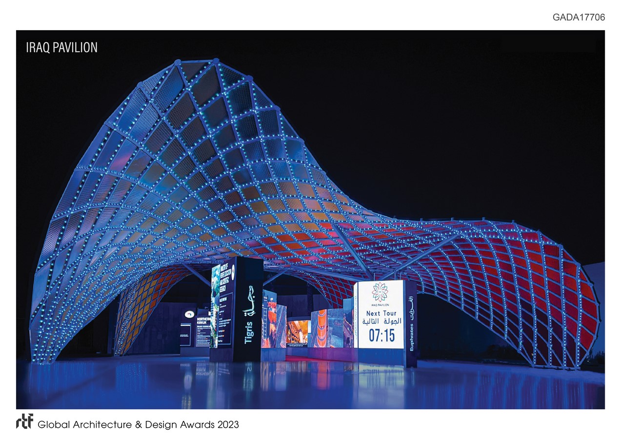 Al Saliya, a traditional fishing net symbolizing wealth, wisdom, and goodness in Mesopotamian culture, inspired the shell structure of the Iraq Pavilion. The design embodies the organic, flowing form of the net-casting technique, symbolizing the capture of future opportunities for a new Iraq in a global development context.