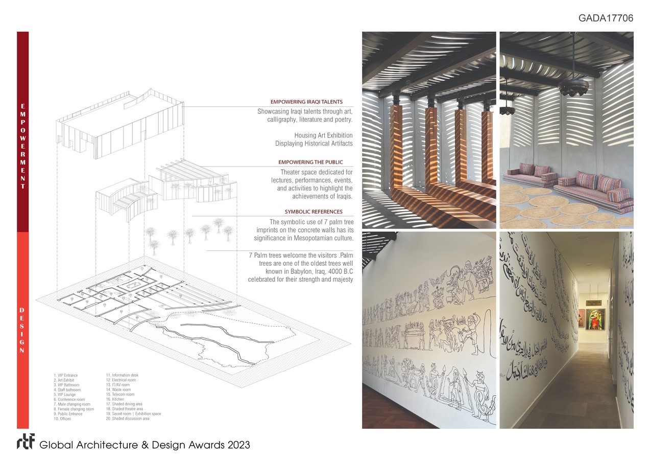Further, as one moves towards the enclosed part of the structure, the design houses art and artifact exhibits, as well as displays of calligraphy artwork celebrating Iraqi poets. It showcased Iraqi talents, empowered the people, and supported small and large businesses in the public and private sectors.