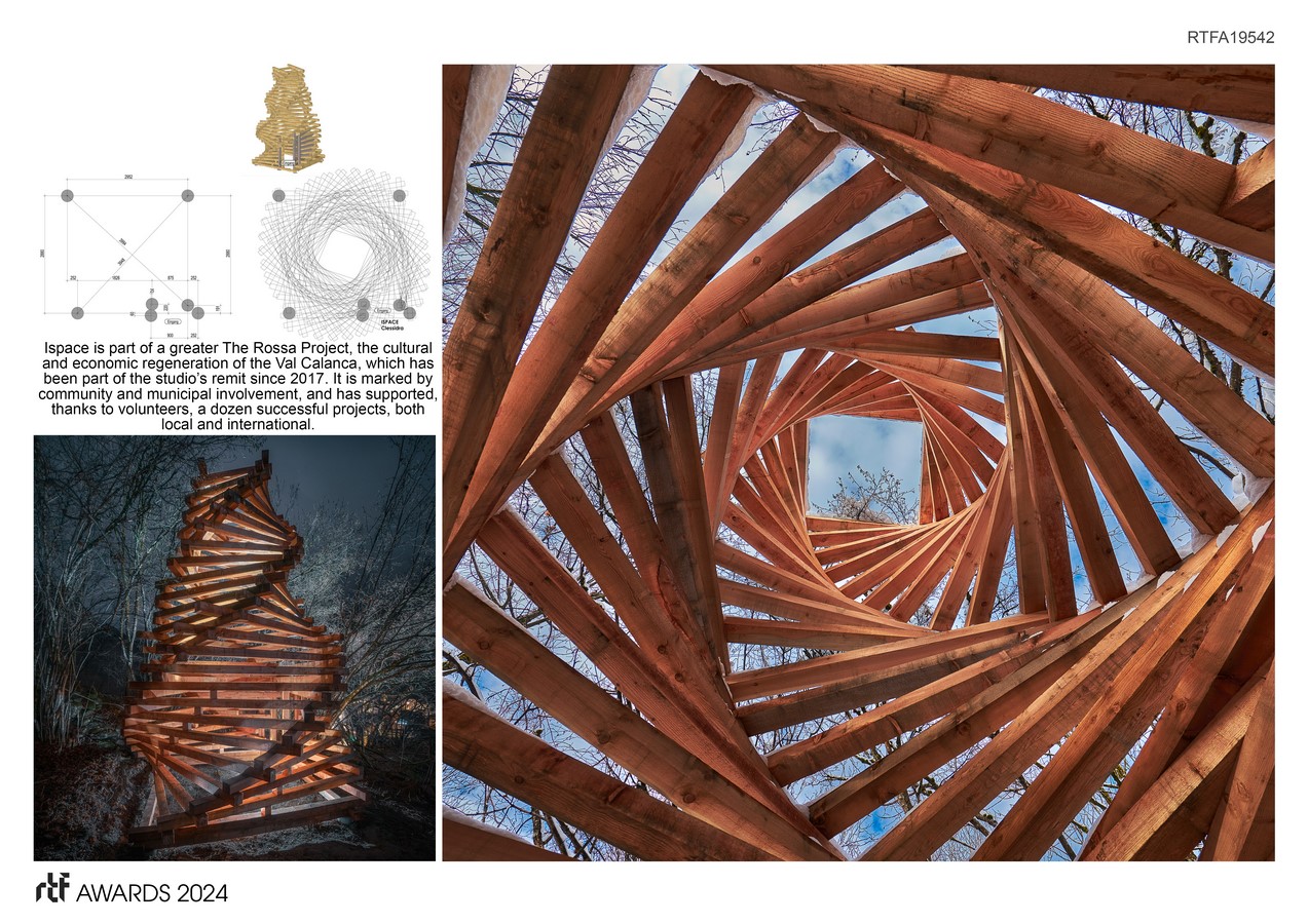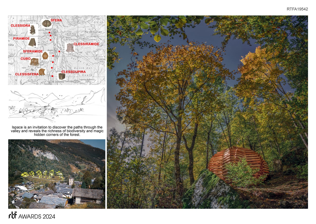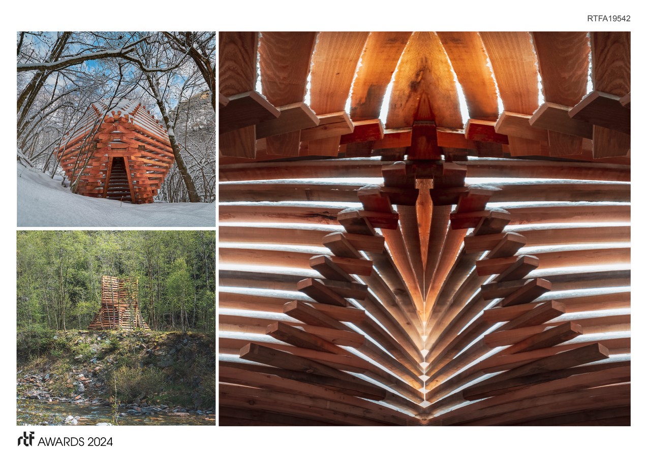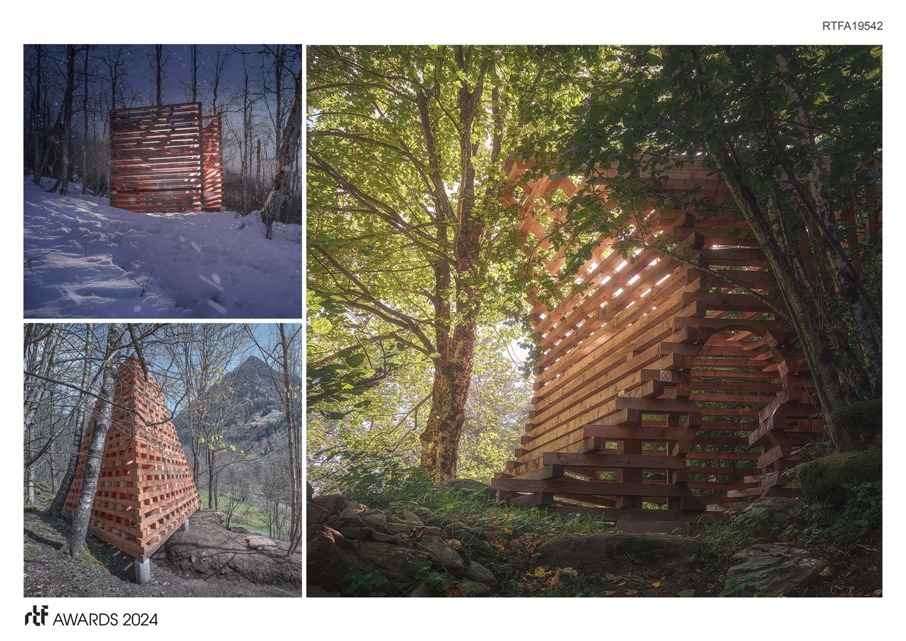 The project consists of the construction of 8 timber pavillions in the local woods of Rossa. The project has involved the inhabitants of the valley, visitors and institutions in working towards a common goal and contributes to the debate on the enhancement of rural areas.