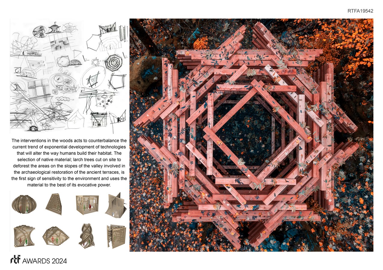 The interventions in the woods acts to counterbalance the current trend of exponential development of technologies that will alter the way humans build their habitat. The selection of native material; larch trees cut on site to deforest the areas on the slopes of the valley involved in the archaeological restoration of the ancient terraces, is the first sign of sensitivity to the environment and uses the material to the best of its evocative power. The purity of design thinking and the almost absence of particular construction techniques remind us of a work that does not need to declare a temporal condition to emphasize the centrality of the relationship between man and nature.