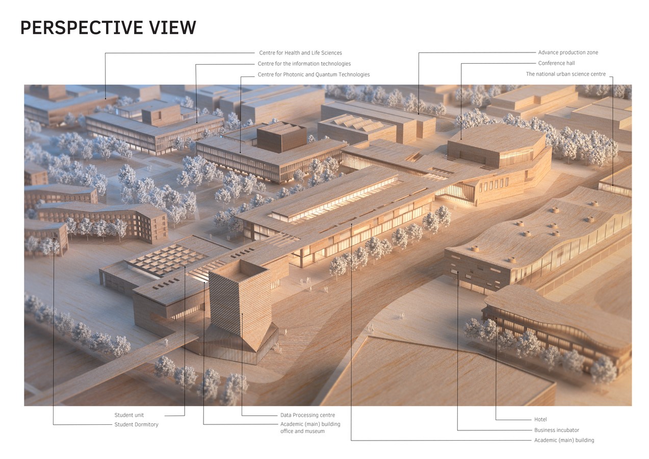 The first part is an education zone or campus, where education, administrative, research buildings, conference halls for events, students’ and academic staff residential accommodation, public spaces, and social and public infrastructure facilities are located. This is where 60% of all Masters Student (3,300 people) and 40% of all PhD students (400 people) will be based.