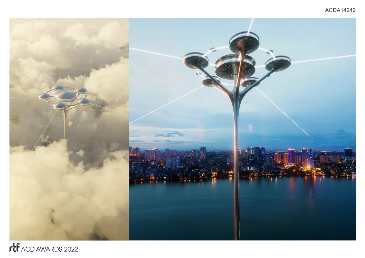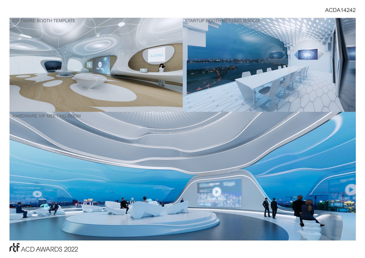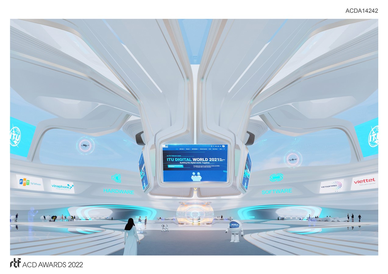 The form of the ehibition represent a virtual structure “ on the clouds”, create a globally connected network infastructure. Main structure is located in diffirent landmarks of Vietnam, with lobby spaces and booths designed in a futuristic style but still combining traditional cultural elements of Vietnam, creating a new identity of Vietnamese architecture in the digital era. Using parametric and computational design method, the design optimized the use of digital tool to create space that can be experience in multi devices, create a exprientail journey from ground to sky, form cutural to technology, from national to global developments.
