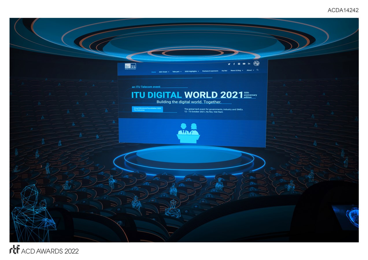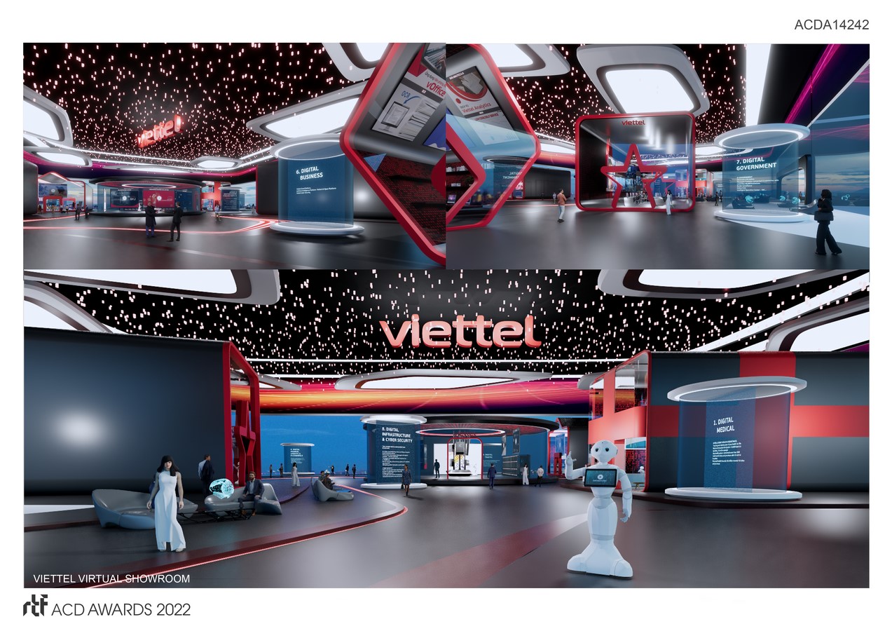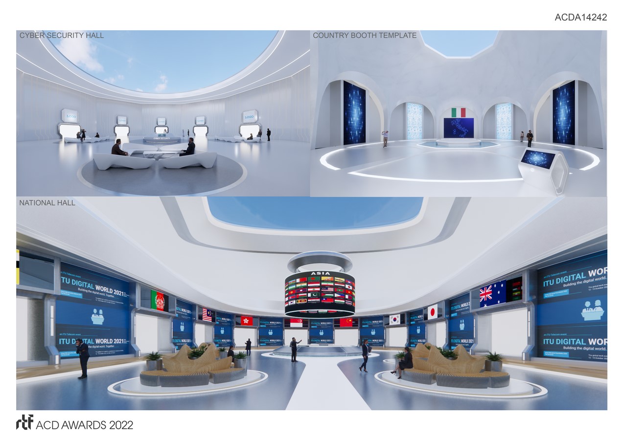 The form of the ehibition represent a virtual structure “ on the clouds”, create a globally connected network infastructure. Main structure is located in diffirent landmarks of Vietnam, with lobby spaces and booths designed in a futuristic style but still combining traditional cultural elements of Vietnam, creating a new identity of Vietnamese architecture in the digital era. Using parametric and computational design method, the design optimized the use of digital tool to create space that can be experience in multi devices, create a exprientail journey from ground to sky, form cutural to technology, from national to global developments.