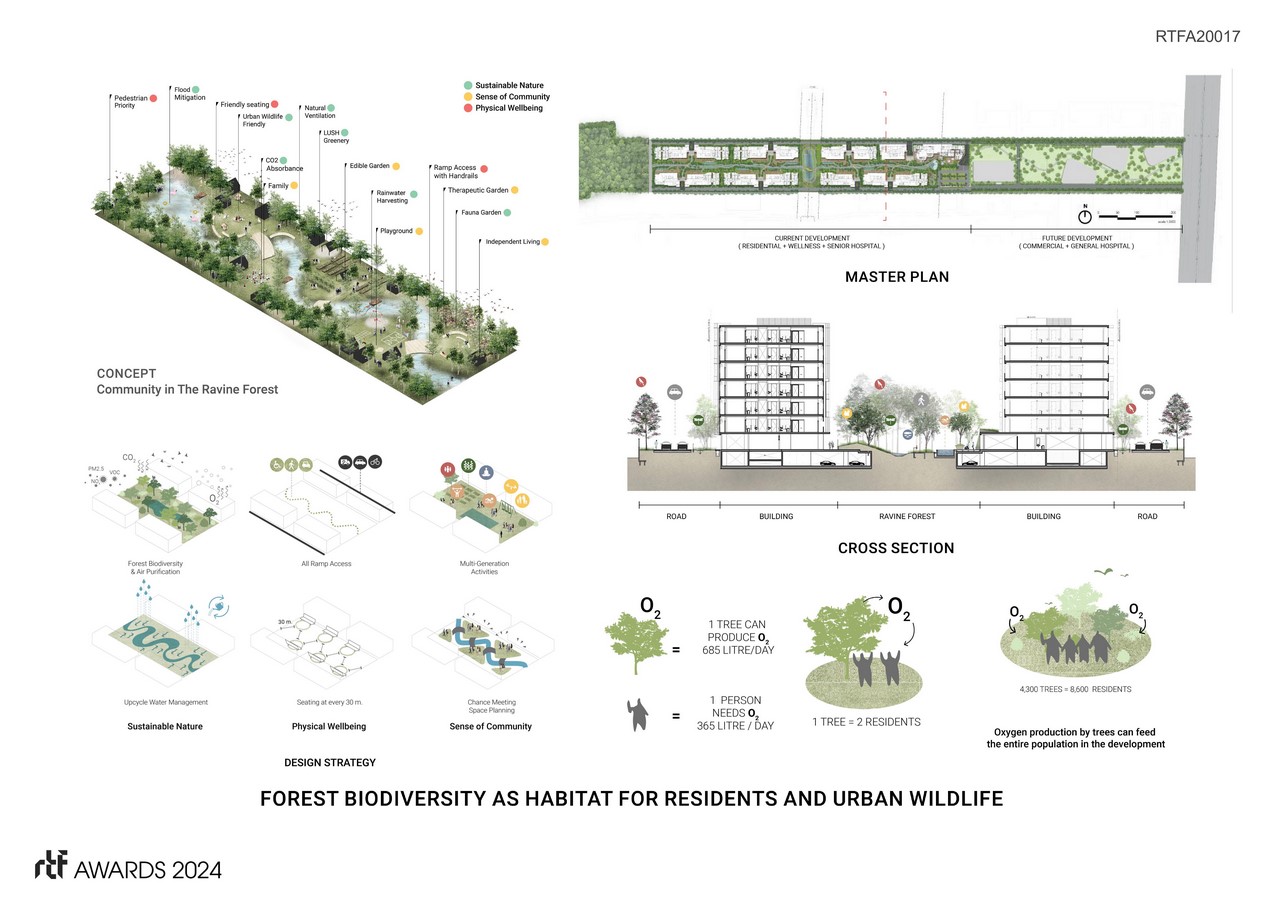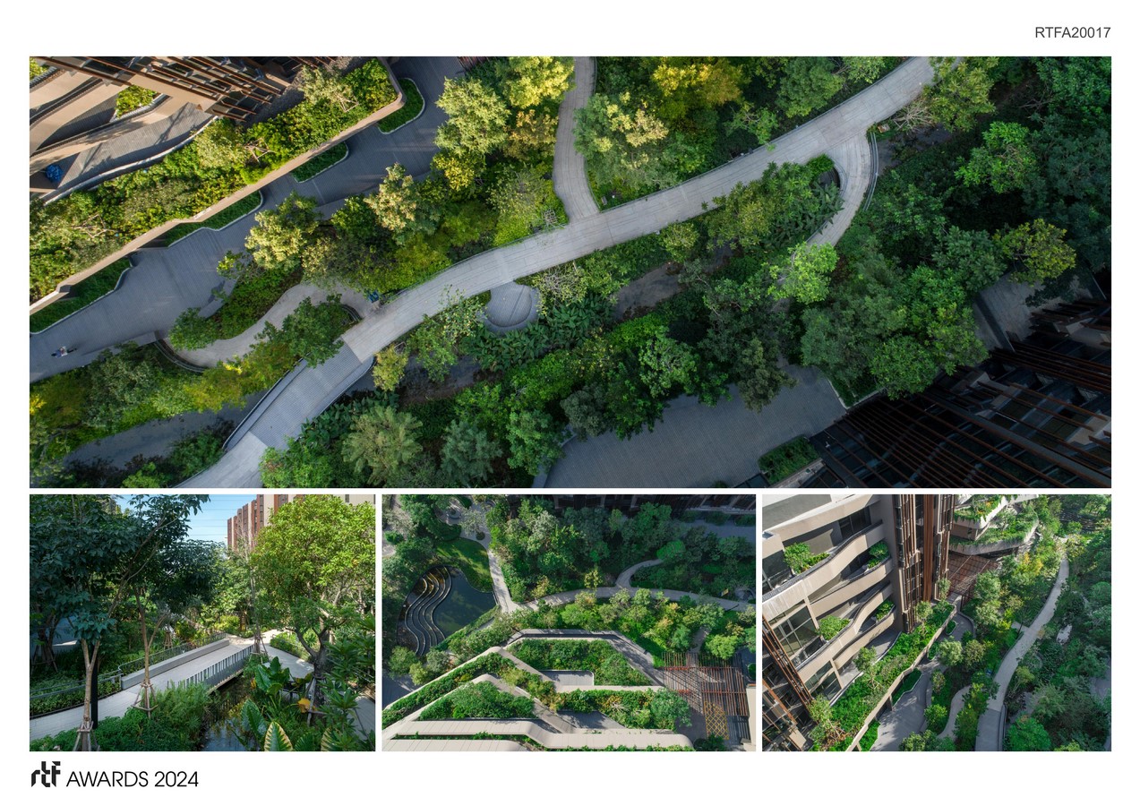 Seeking a new typology of future communities, ‘Jin Wellbeing County’ has become the first senior oriented mixed-use development in Thailand comprising residence, commercial unit, and hospital. Its planning focuses on 3 principles – ‘Sustainable Nature’, ‘Physical Wellbeing’, and ‘Sense of Community’, responding to seniors’ needs. Diverse activity dynamics are designed through ‘Retreat’, ‘Engage’ and ‘Create’ concepts which enhance all-round living experience. Together with our initial research on “The Seven Dimensions of Wellness,” marking beneficial approaches for aging life, all aspects are embedded in the landscape design to truly achieve “Community in the Ravine Forest.”