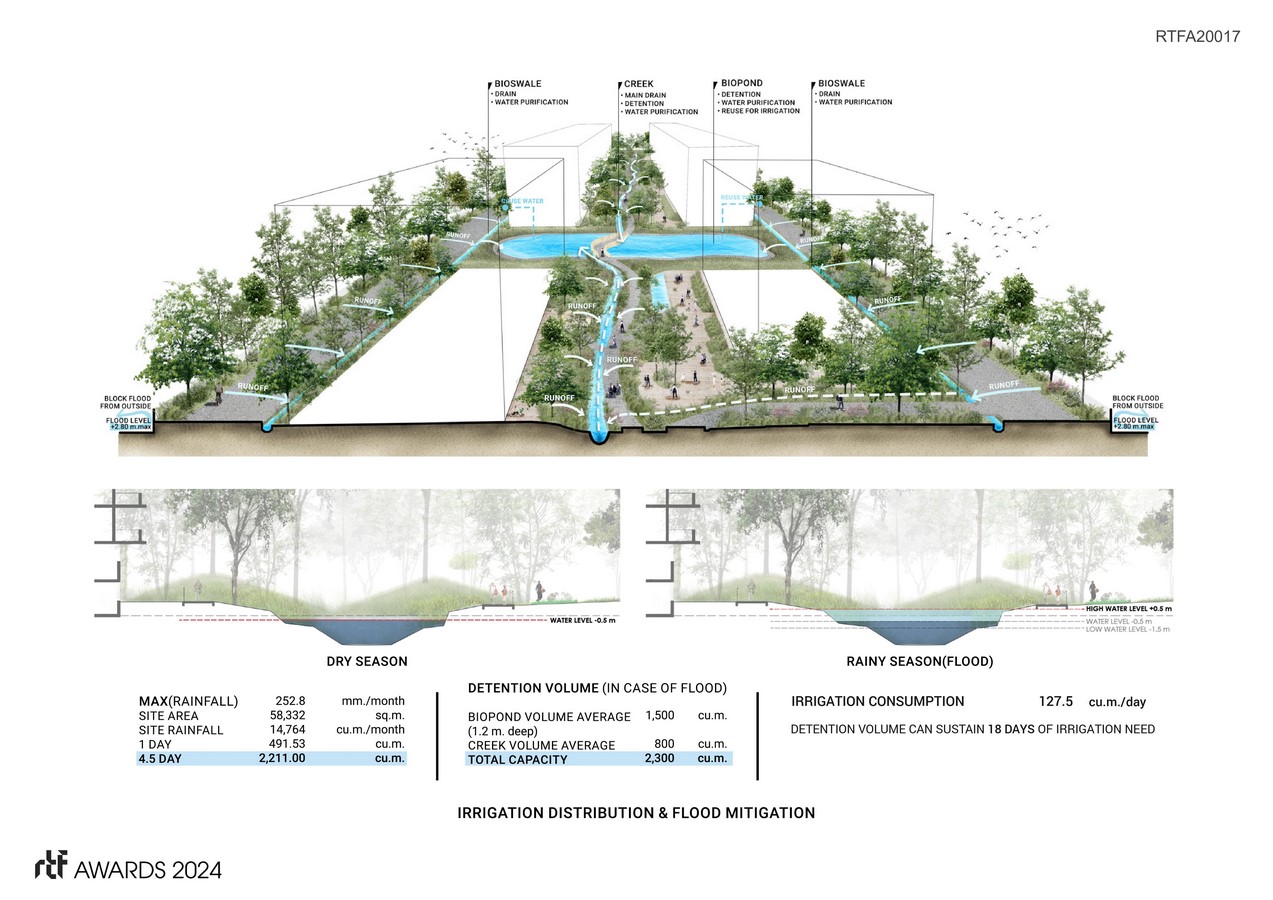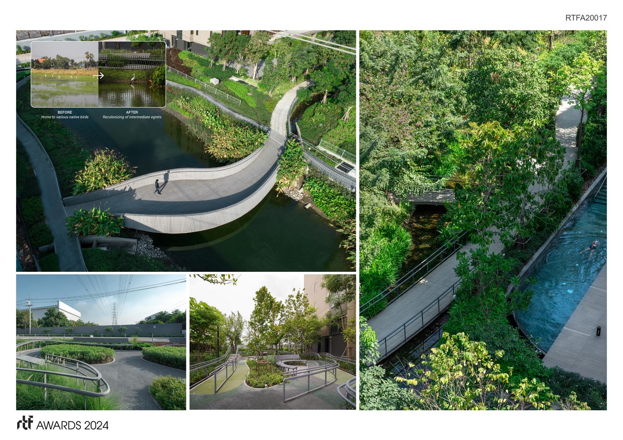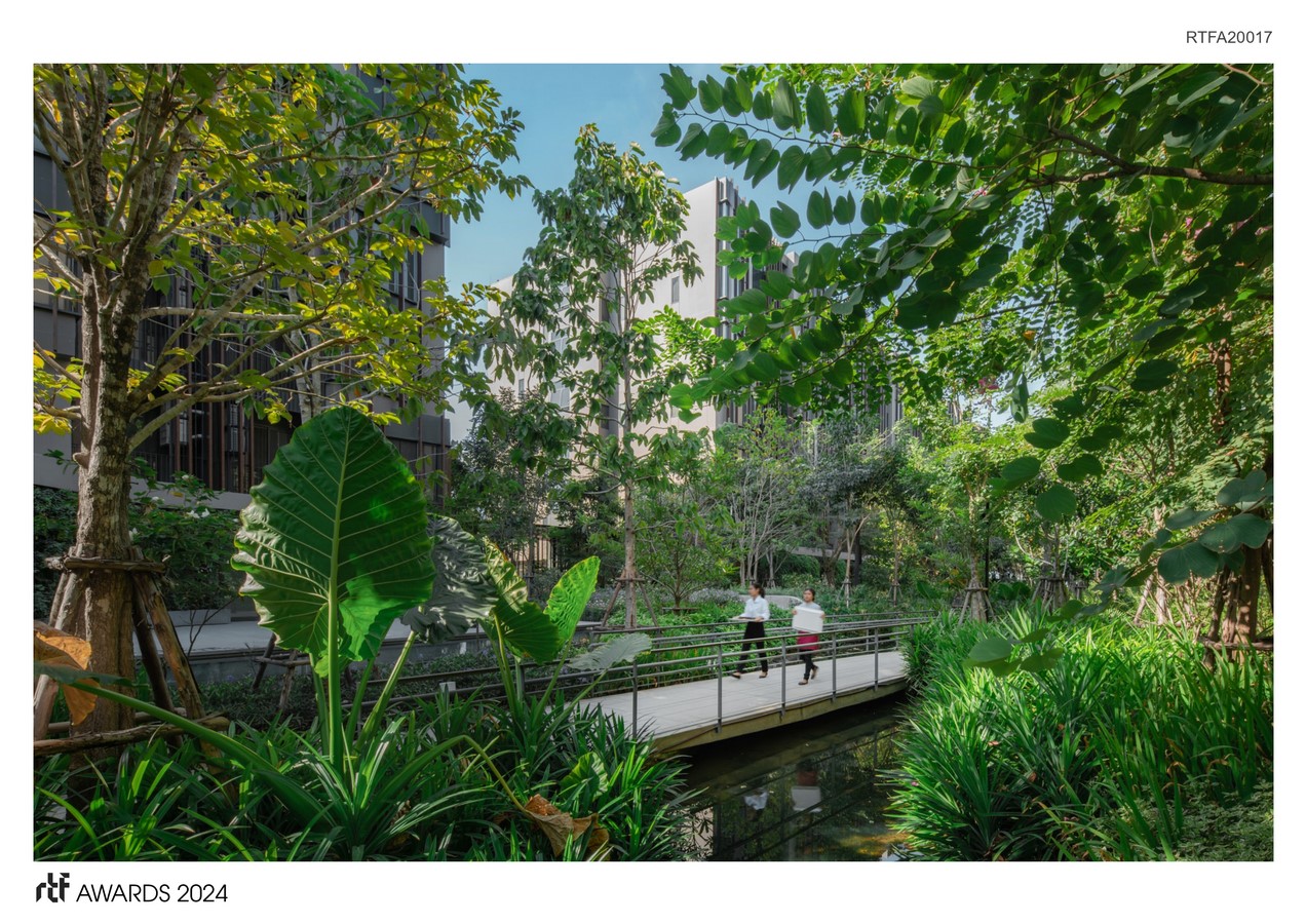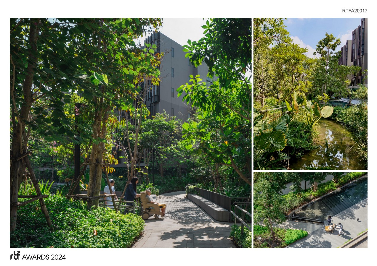 By blocking the flow of water, Bangkok and its suburbs have faced critical phenomena such as 2011 Thailand Floods and regular flash floods during the rainy season. As a result, Jin Wellbeing County is designed thoughtfully with a consideration to the public and surrounding site, by adopting “Polder System,” which helps retain water before releasing to public amenity, apart from doing typical landfill methods. This approach potentially helps maintain flood in urban areas, leading to a resilient living, if used in every site around the city.
