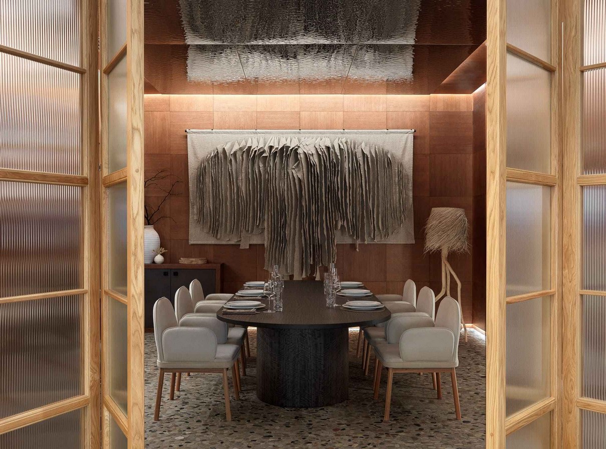 Even though the restaurant is located in the epicenter of the metropolis, MEGRE INTERIORS has curated an atmosphere that submerges guests into an atmosphere of peace and relaxation.