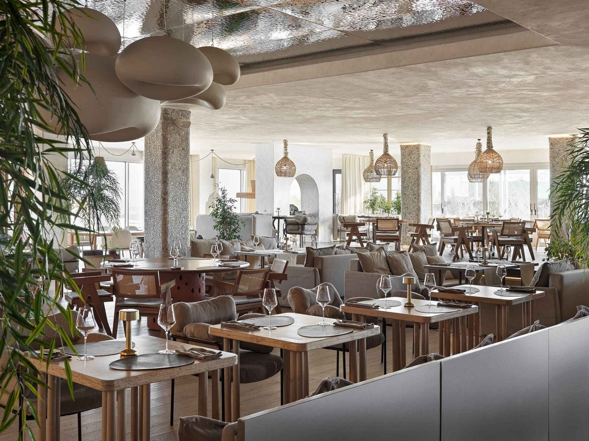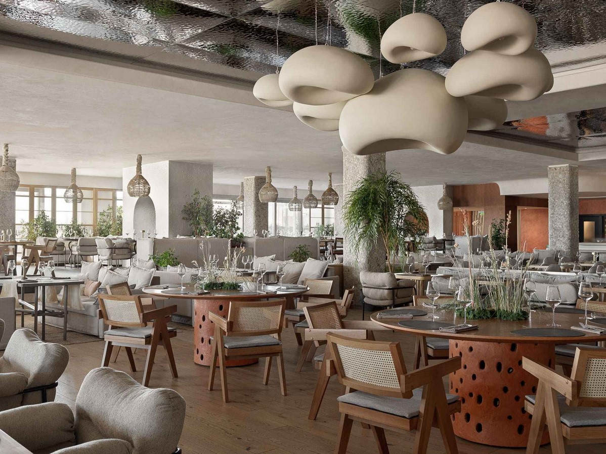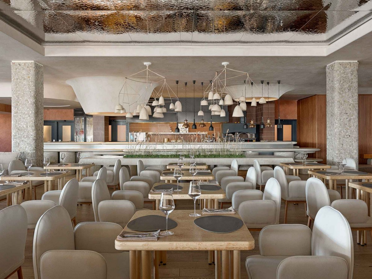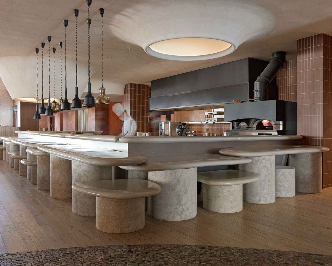 A wood-burning pizza oven and central island upon which Chef de Cuisine assembles his plates are a mesmerizing central feature too. The neutral color scheme of creams is complemented with golden oak birch woods and is reminiscent of autumn coastal landscapes and Indian summer.