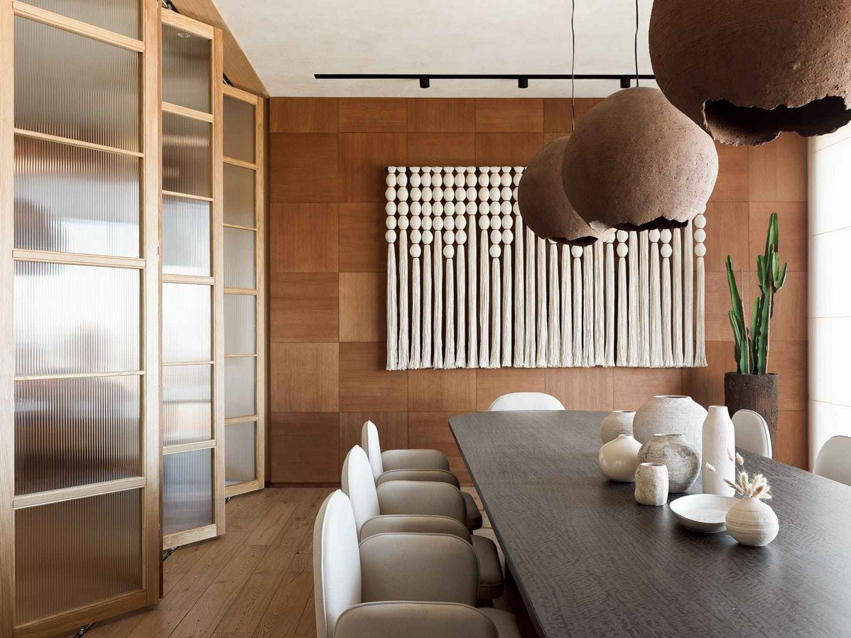 The plush, pillow-like sofas, call upon guests to plunge into an atmosphere of relaxation and slow living. The walls and floors are finished in earthy tones, where a play between rough, textured, smooth and glossy surfaces keeps one’s senses engaged. The unusual ceiling is adorned in unique artisan lighting fixtures and moon-like craters that host accent lighting.