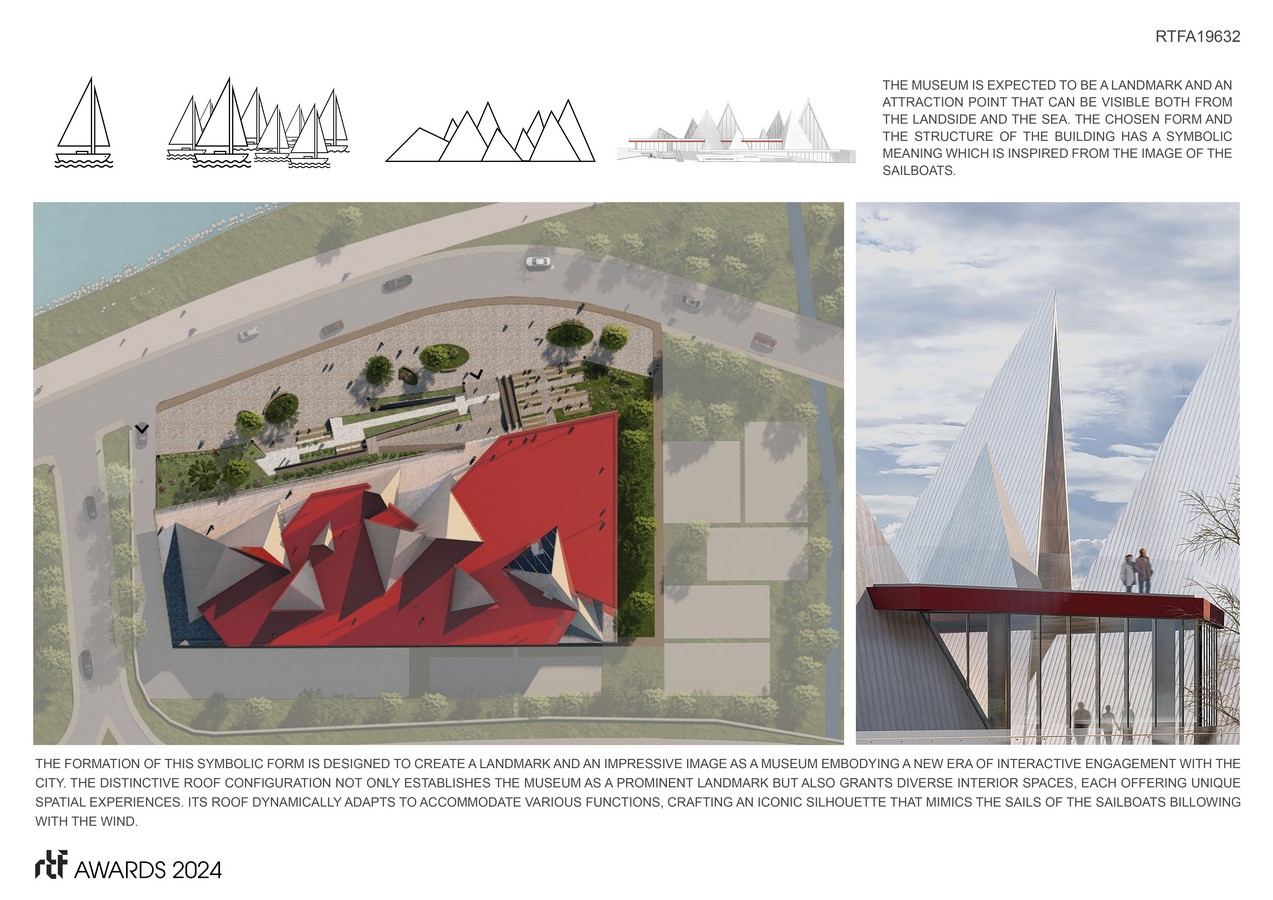 The museum is expected to be a landmark and an attraction point that can be visible both from the landside and the sea. The chosen form and the structure of the building has a symbolic meaning which is inspired from the image of the sailboats. The formation of this symbolic form is designed to create a landmark and an impressive image as a museum embodying a new era of interactive engagement with the city. The distinctive roof configuration not only establishes the museum as a prominent landmark but also grants diverse interior spaces, each offering unique spatial encounters. Its roof dynamically adapts to accommodate various functions, crafting an iconic silhouette that mimics the sails of the sailboats billowing with the wind.