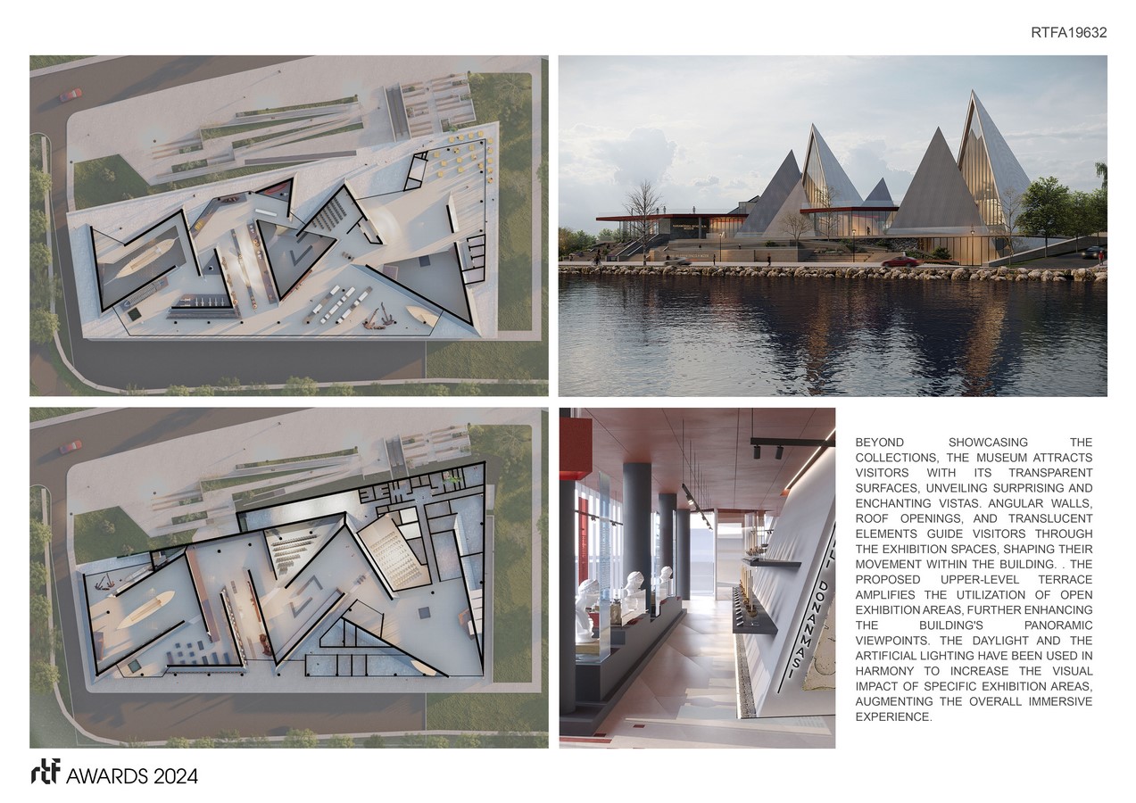 Beyond showcasing the collections, the museum attracts visitors with its transparent surfaces, unveiling surprising and enchanting vistas. Angular walls, roof openings, and translucent elements guide visitors through the exhibition spaces, shaping their movement within the building. The proposed upper-level terrace amplifies the utilization of open exhibition areas, further enhancing the building’s panoramic viewpoints. The daylight and the artificial lighting have been used in harmony to increase the visual impact of specific exhibition areas, augmenting the overall immersive experience.
