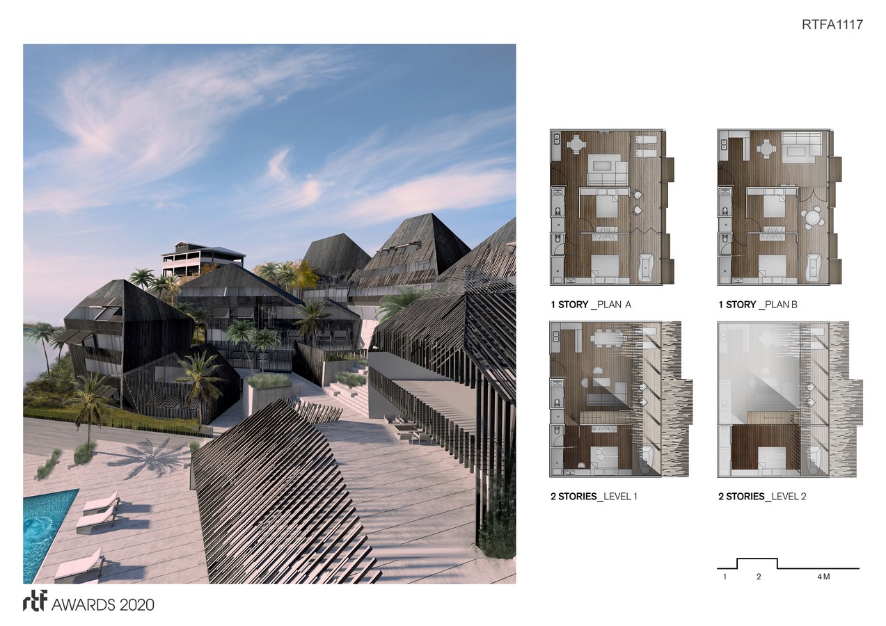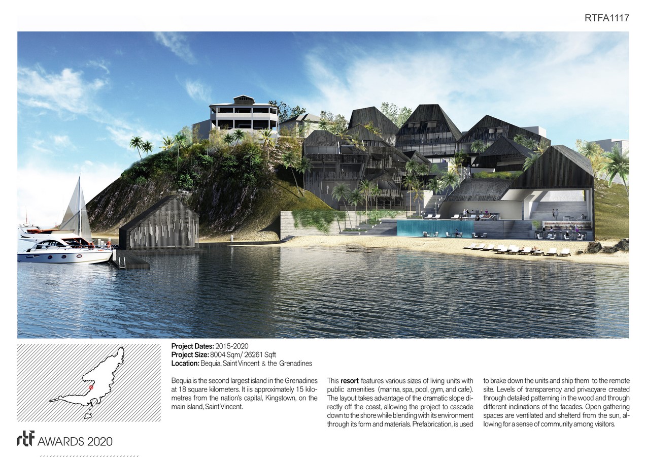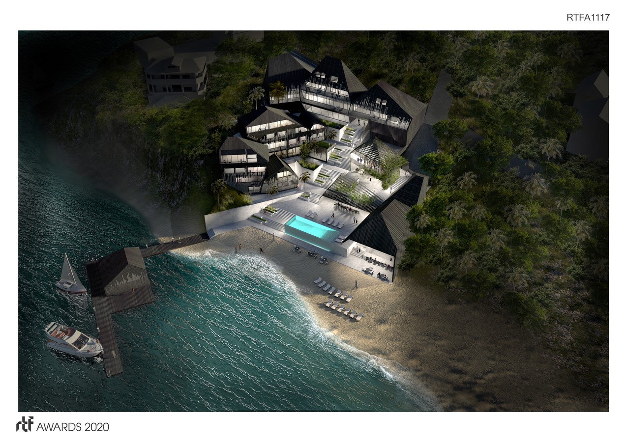 Programmatically, it features various sizes of living units with public amenities such as a marina, spa, pool, gym, and a cafe/bar. The layout takes advantage of the dramatic slope directly off the coast, allowing the project to cascade down to the shore while blending with its environment with its subtle form and materials. A simple layout and material system allows levels of transparency and privacy through detailed patterning in the wood and through directional / elevation changes in the units. Open gathering spaces create a level of shading while retaining airflow with adjacencies to amenities, allowing for a sense of community among visitors.