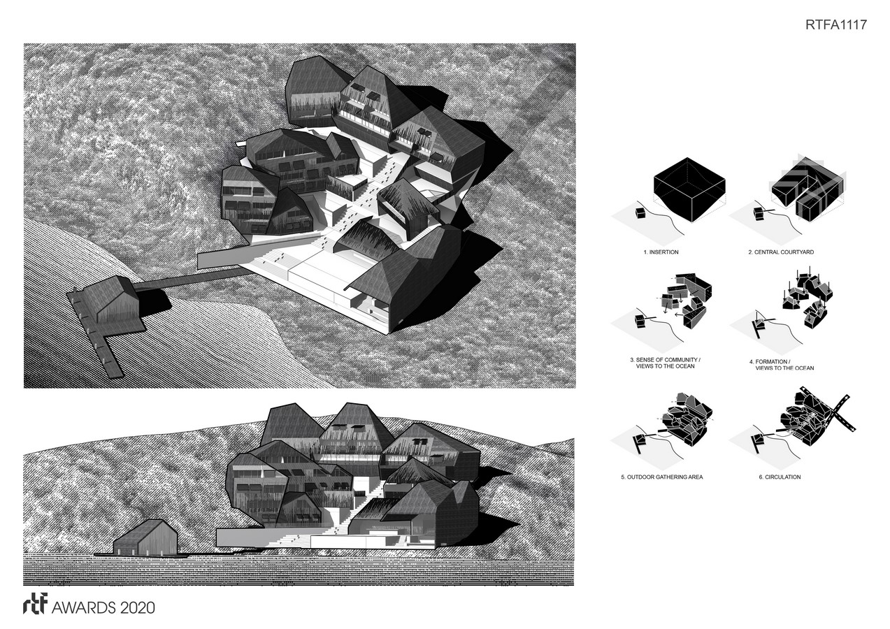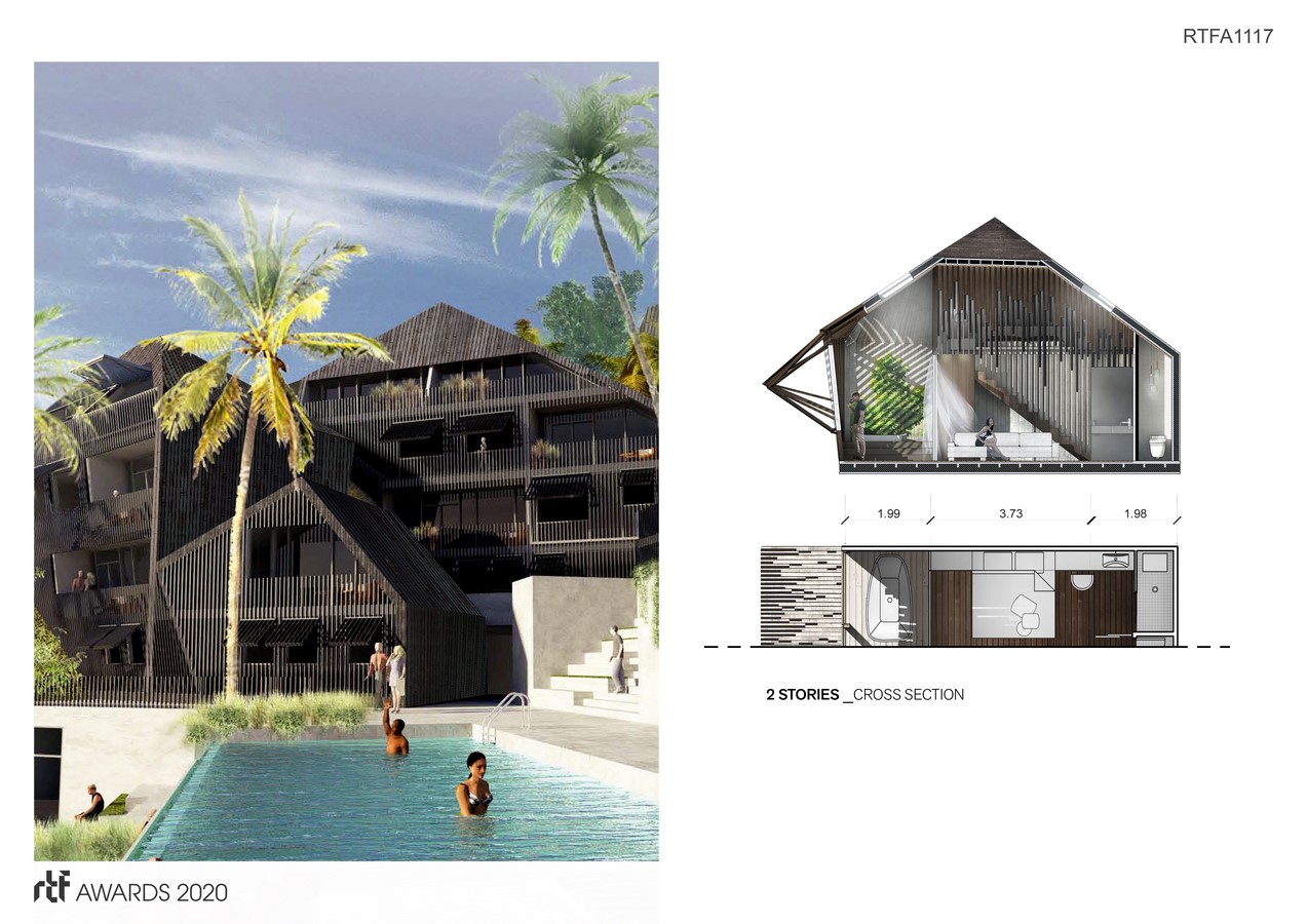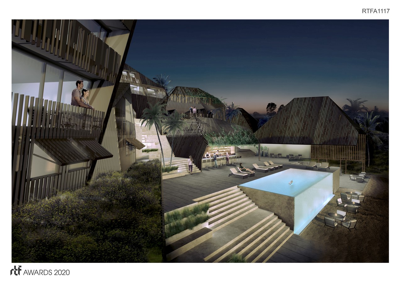 Programmatically, it features various sizes of living units with public amenities such as a marina, spa, pool, gym, and a cafe/bar. The layout takes advantage of the dramatic slope directly off the coast, allowing the project to cascade down to the shore while blending with its environment with its subtle form and materials. A simple layout and material system allows levels of transparency and privacy through detailed patterning in the wood and through directional / elevation changes in the units. Open gathering spaces create a level of shading while retaining airflow with adjacencies to amenities, allowing for a sense of community among visitors.