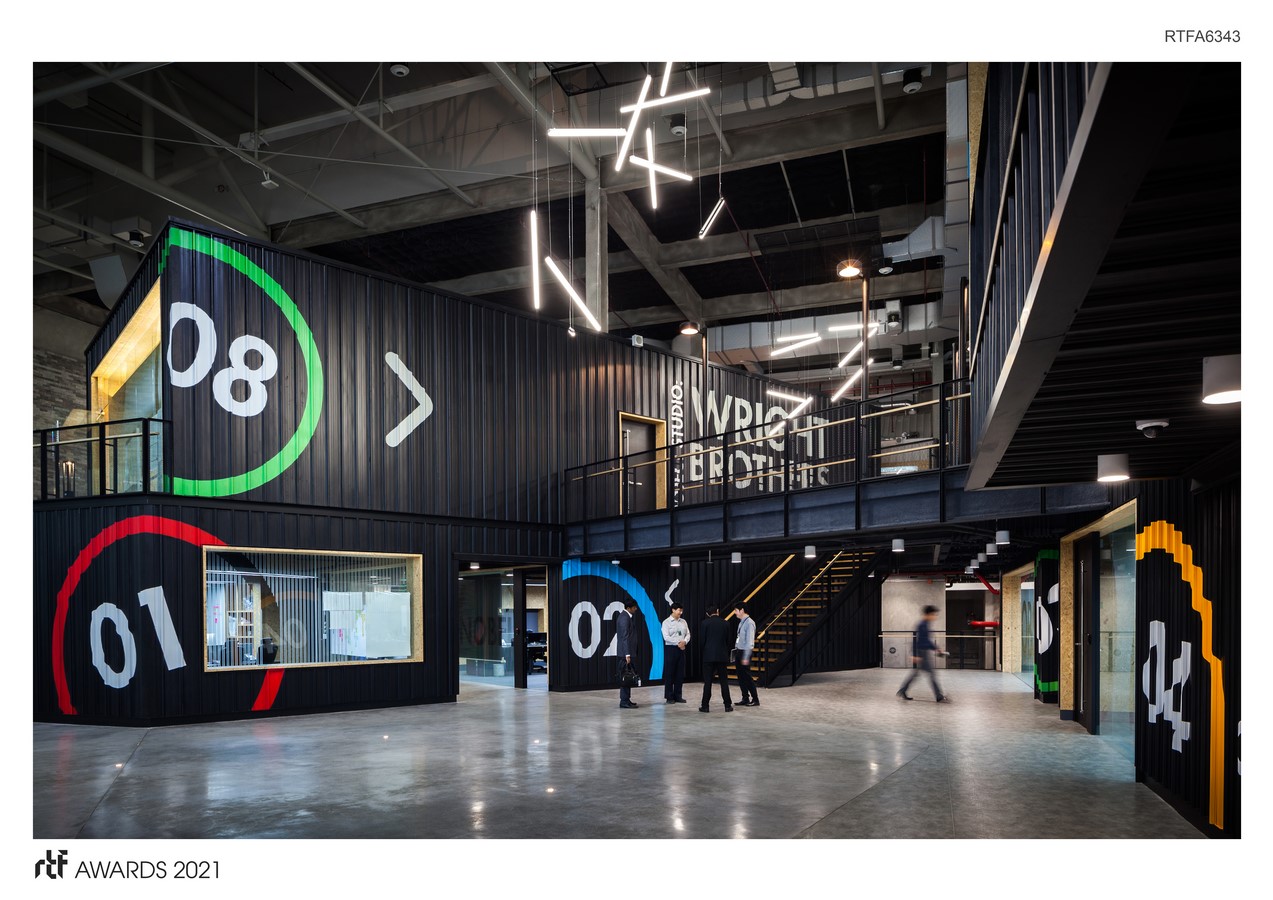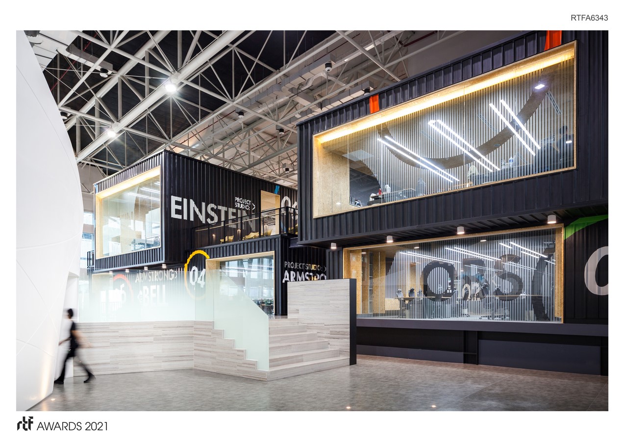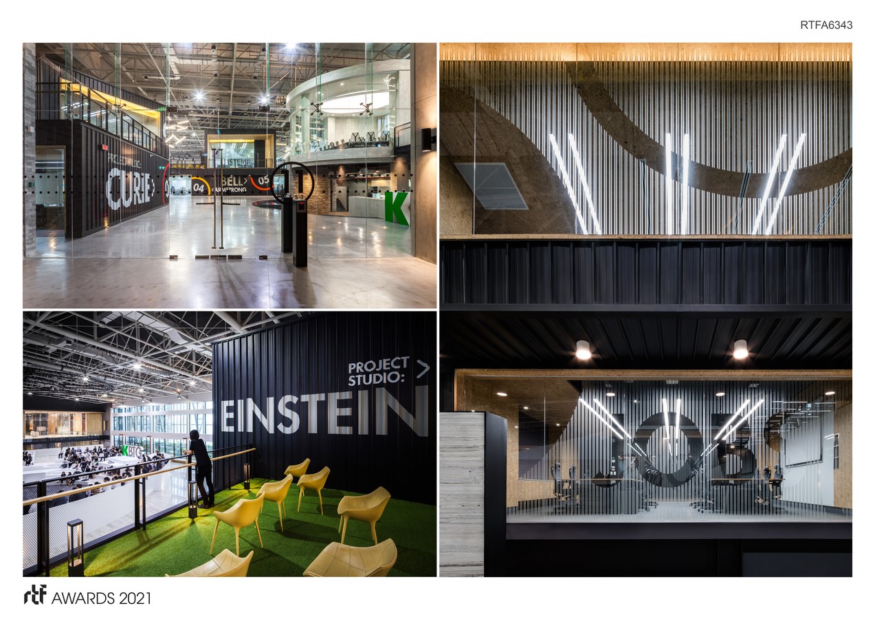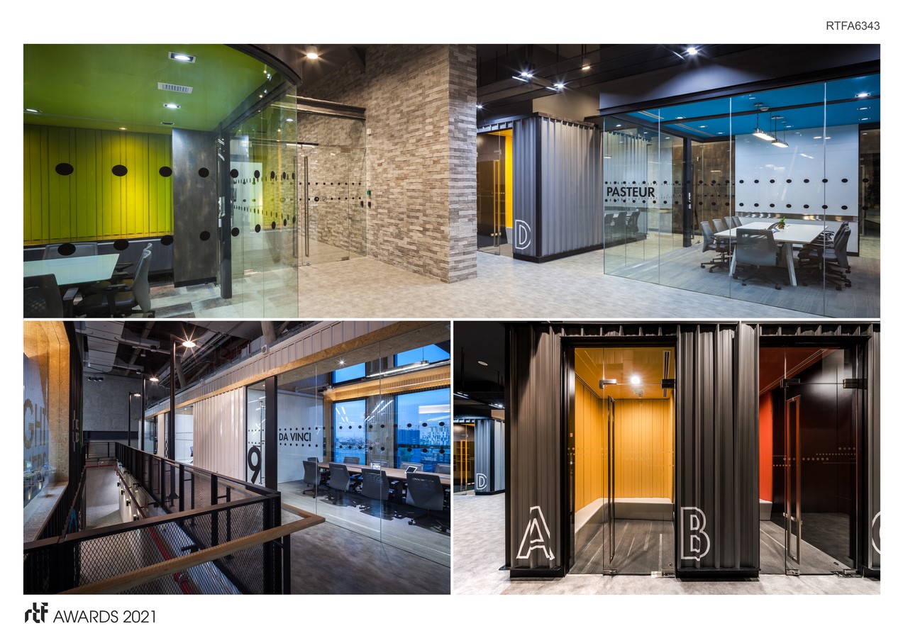 The details of the graphic design include the names of the studios, which are taken from the world’s most inspiring innovators whose brought incredible contributions to the world. Additionally, each studio wall patterns and glass films are visualized to be in one interconnected story. It emphasizes the users’ awareness in the role of purpose of the space where new innovations are brought to life and how it is conceived to enhance users’ creativity, and the significance of such creative force in the development of the organization. Ultimately, what the design brings is the stimulus to users’ creative thinking, allowing new ideas and innovations to be created.