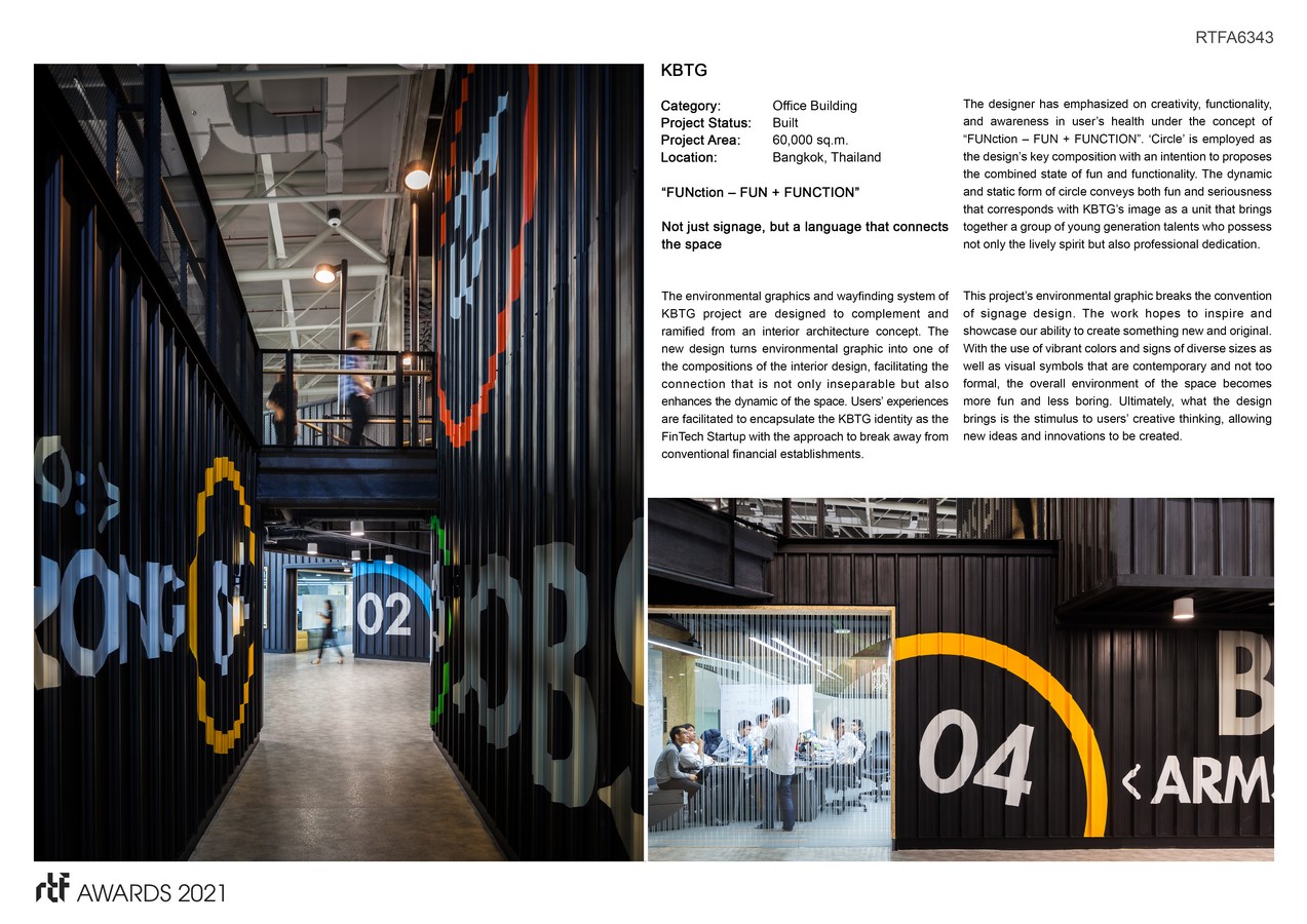 The designer has emphasized on creativity, functionality, and awareness in user’s health under the concept of “FUNction – FUN + FUNCTION”. ‘Circle’ is employed as the design’s key composition with an intention to proposes the combined state of fun and functionality. The dynamic and static form of circle conveys both fun and seriousness that corresponds with KBTG’s image as a unit that brings together a group of young generation talents who possess not only the lively spirit but also professional dedication.