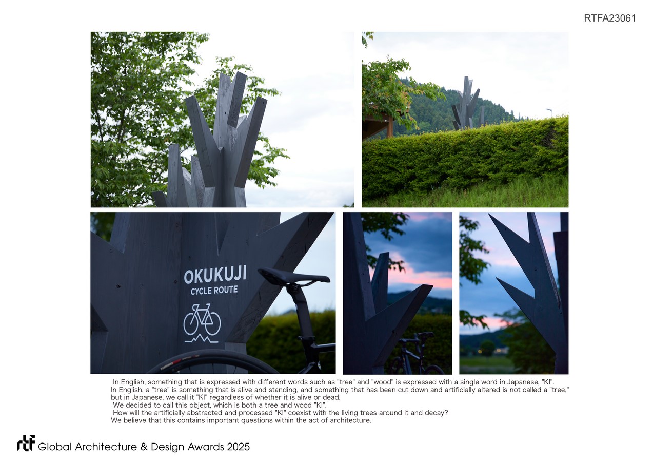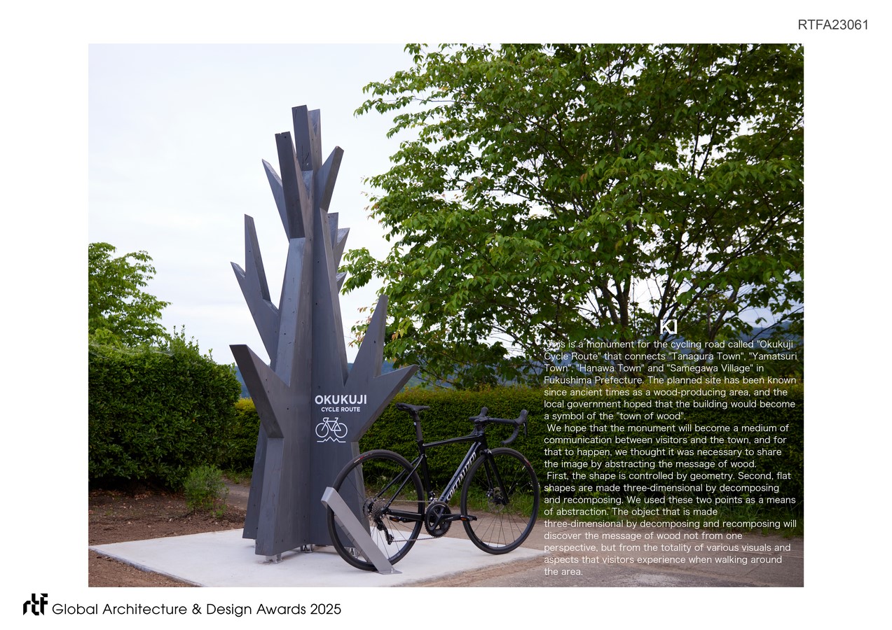 This is a monument for the cycling road called “Okukuji Cycle Route” The planned site has been known since ancient times as a wood-producing area, and we hoped that the building would become a symbol of the “town of wood.”
