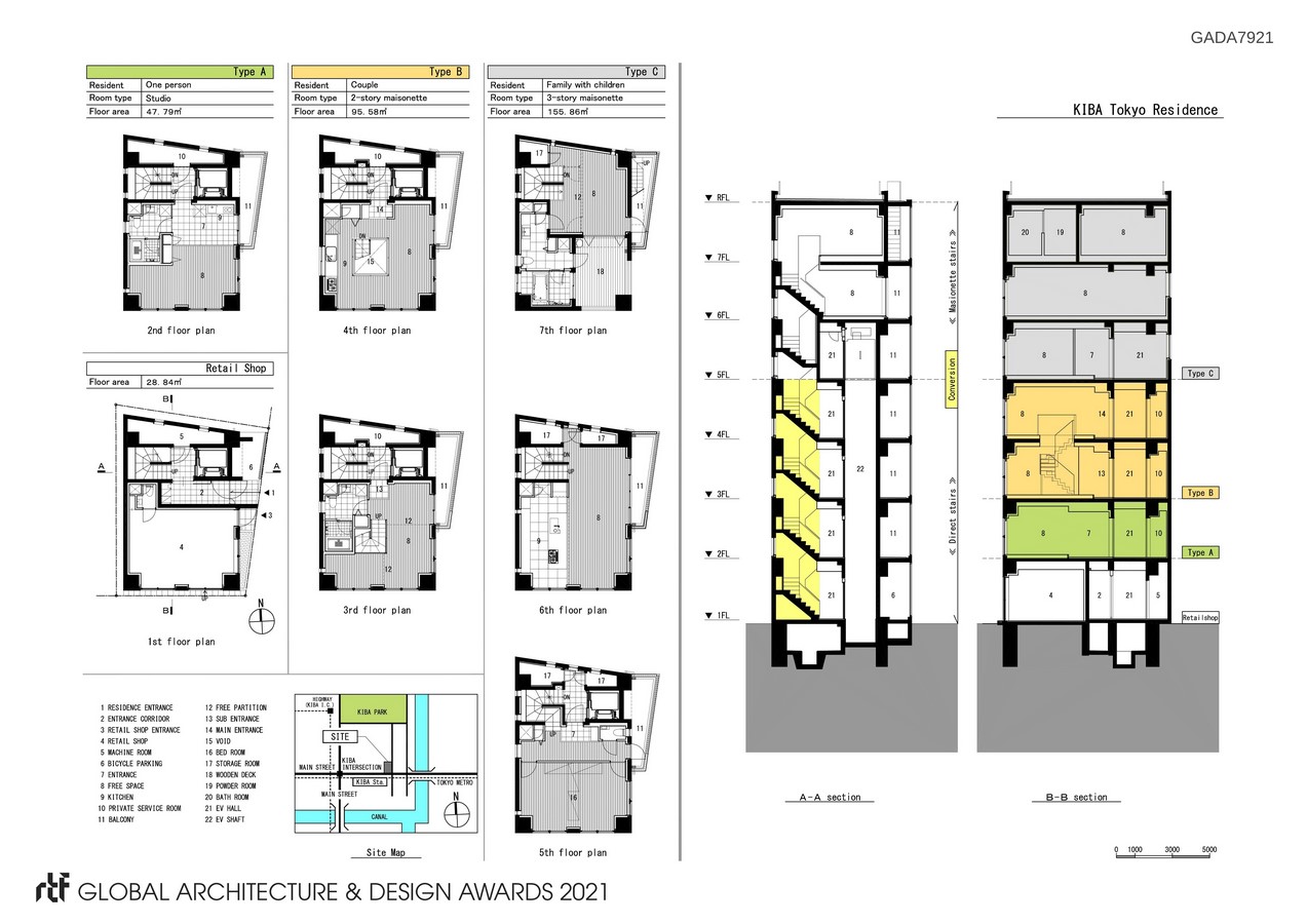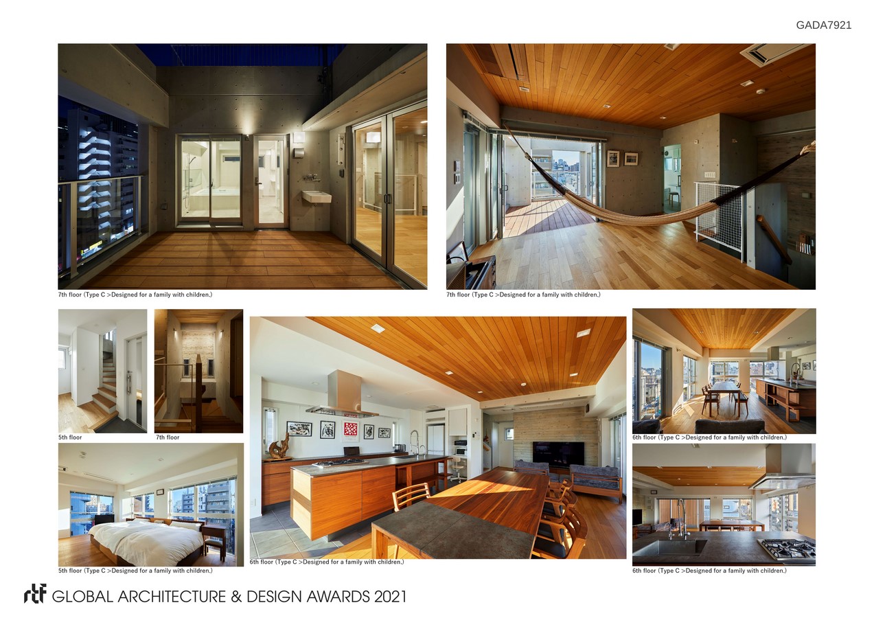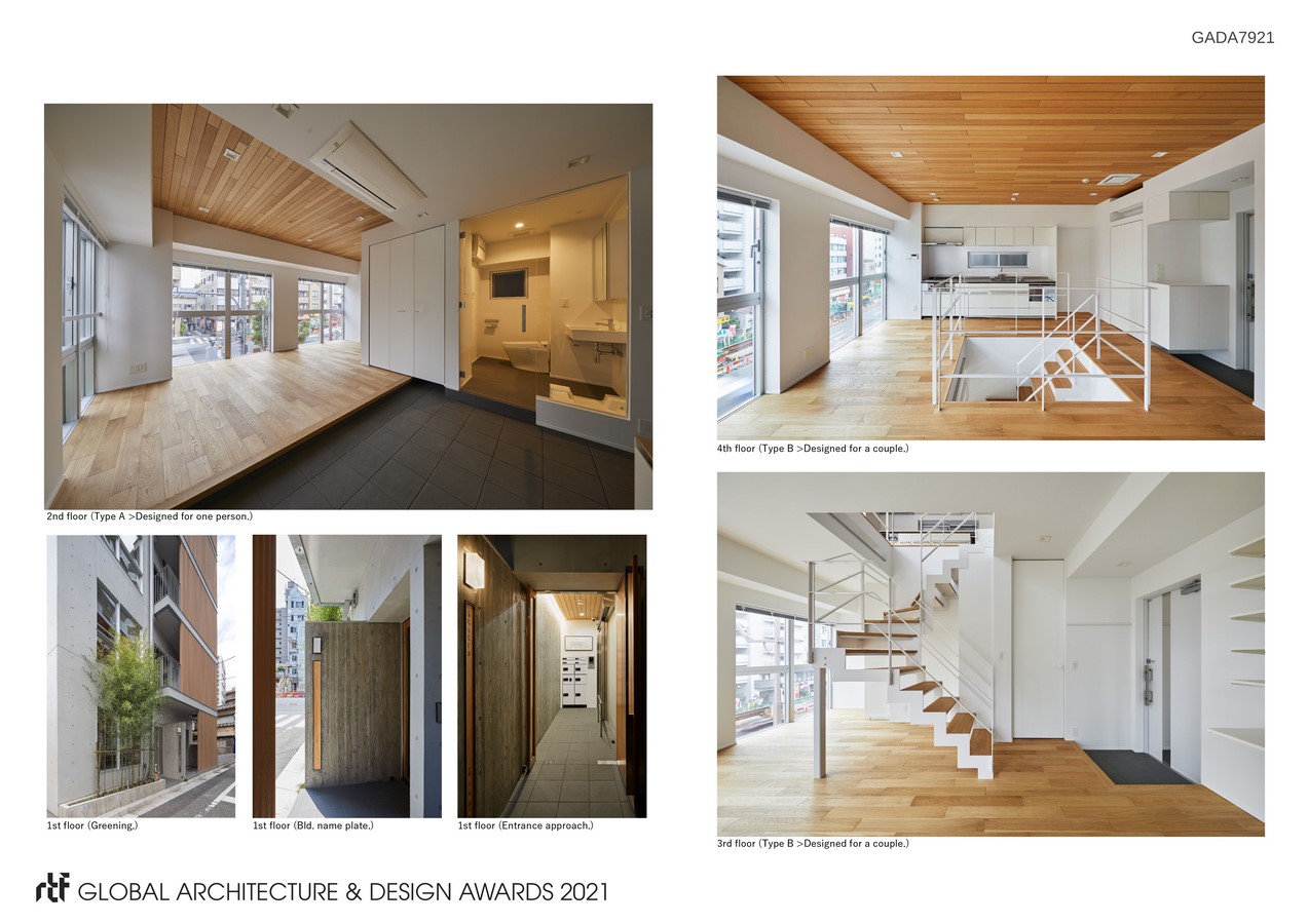 In order to adapt the various lifestyles of the city as well as maximize the potential of the small building, we designed the structure with multiple spaces based on the lifestyle despite the strict restrictions given by the size of the site. Therefore, we accomplished to have 3 different types of housings, namely a residence for one person (Type A), a couple (Type B) and a family with children (Type C) in a single building. Even though the size of the building is small, the different types of housings are being together, therefore constructed the fine community of a residence in a city.